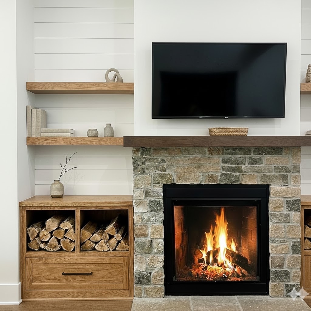 take the attached image and adjust the shiplap paneling so that it only extends up to the floating shelves keep everything else in the image exactly the same including colors finishes and lighting make the image hyper realistic for a client presentation