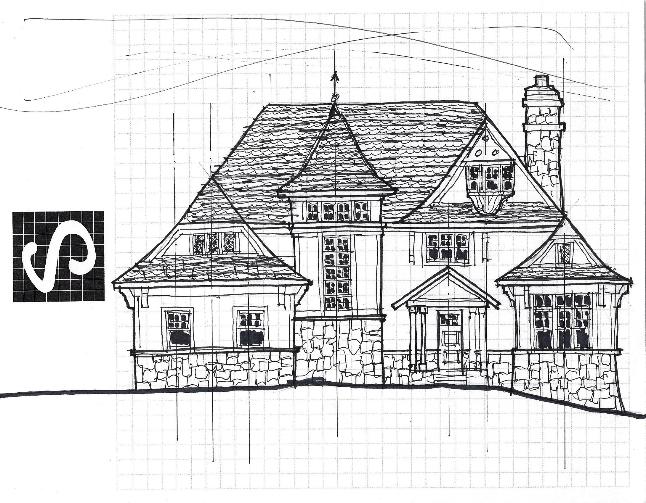render with partly cloudy sky beige stucco black roof and stone black windows