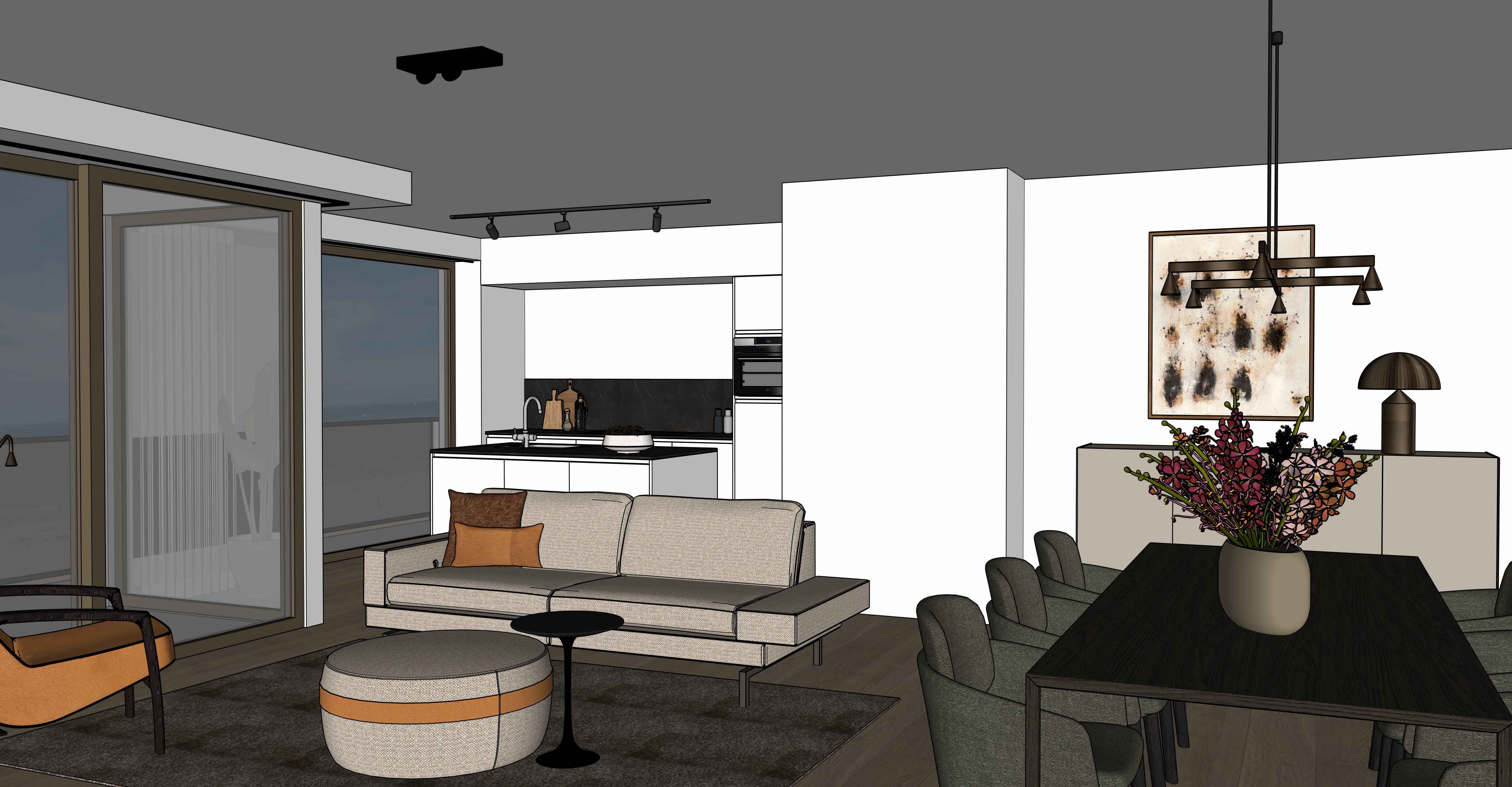 realistic interior shot natural warm daylight sea and beach view floor is light oak pouf same fabric as sofa maintain textures and colors tv cabinet the same as other dressoir