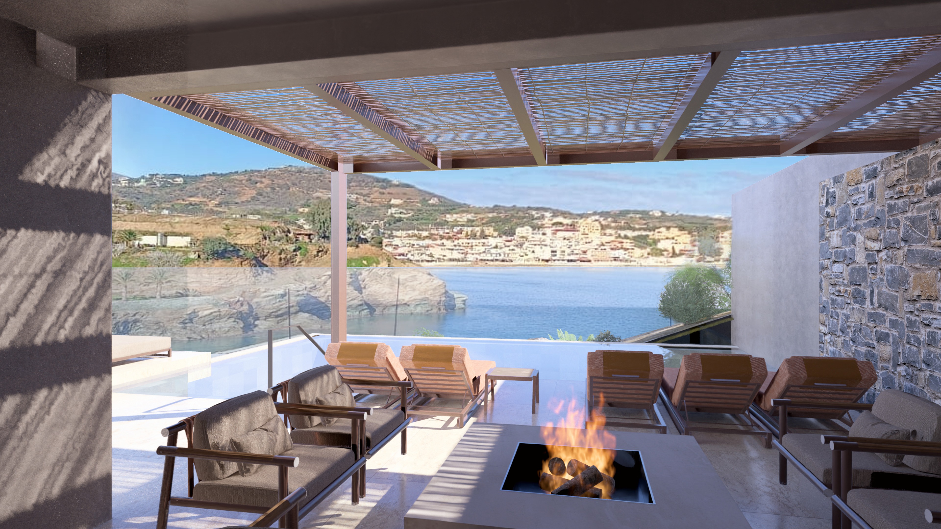 hyper realistic golden hour image of a villa with a sparkling blue swimming pool on a mountain overlooking the aegean sea