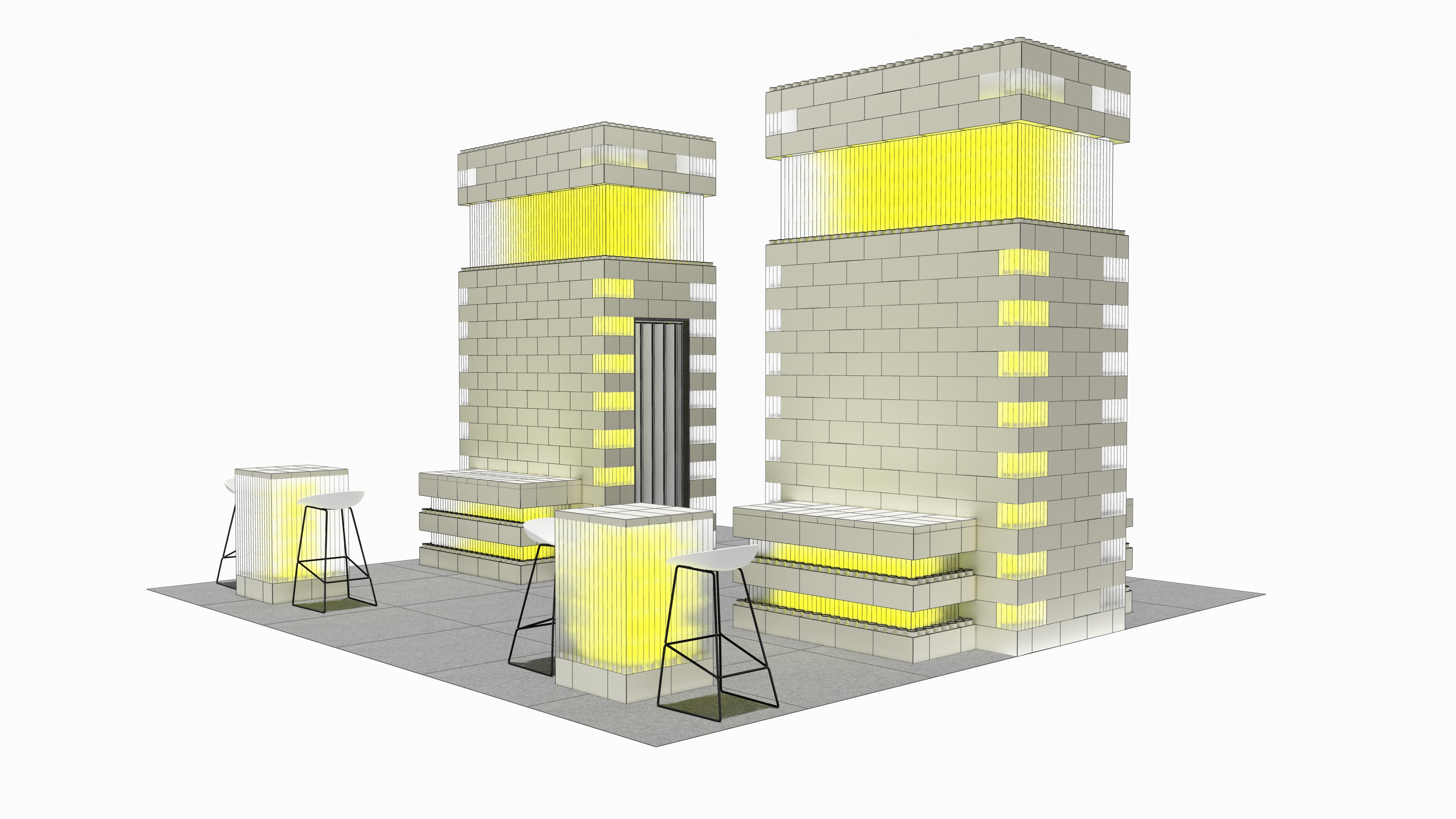 a stunning photorealistic architectural visualization of a modular exhibition booth rendered within a busy modern event hall environment use ultra realistic lighting material accuracy and cinematic composition the scene should capture the dynamic energy of an active exhibition blurred motion of people walking soft reflections on polished concrete flooring and ambient light diffusion from large ceiling mounted fixtures include distant booths banners and soft focus background lighting to create depth and realism render with physically based materials matte plastics brushed metal frosted acrylic and glass under accurate global illumination use a wide angle perspective 24 28mm lens equivalent at human eye level for immersive realism maintain sharp detailing on the foreground structure while keeping background motion naturally diffused shadows should be soft but defined with balanced warm and cool light interplay the overall mood should feel vibrant professional and authentic as if photographed during a real international trade fair