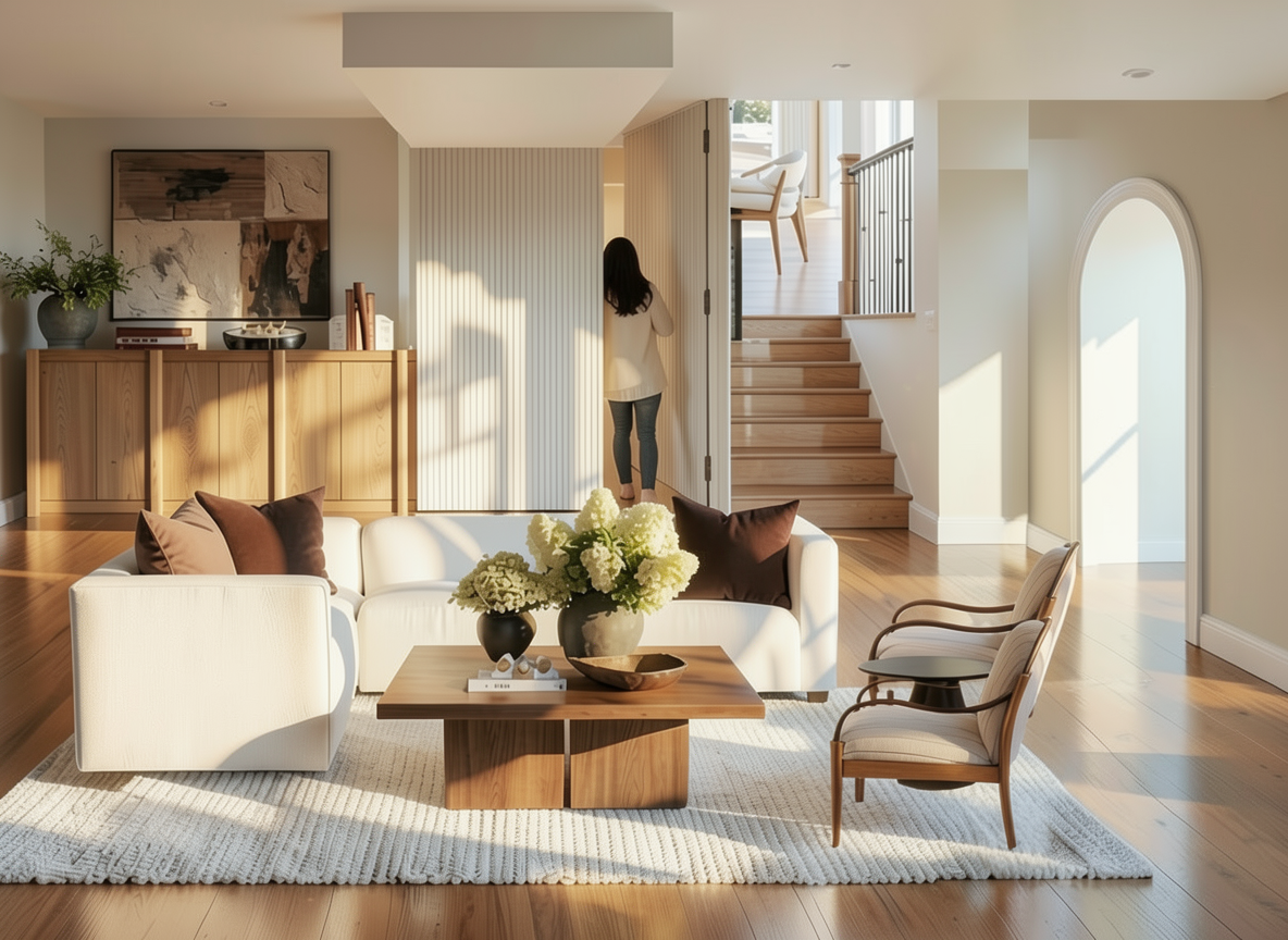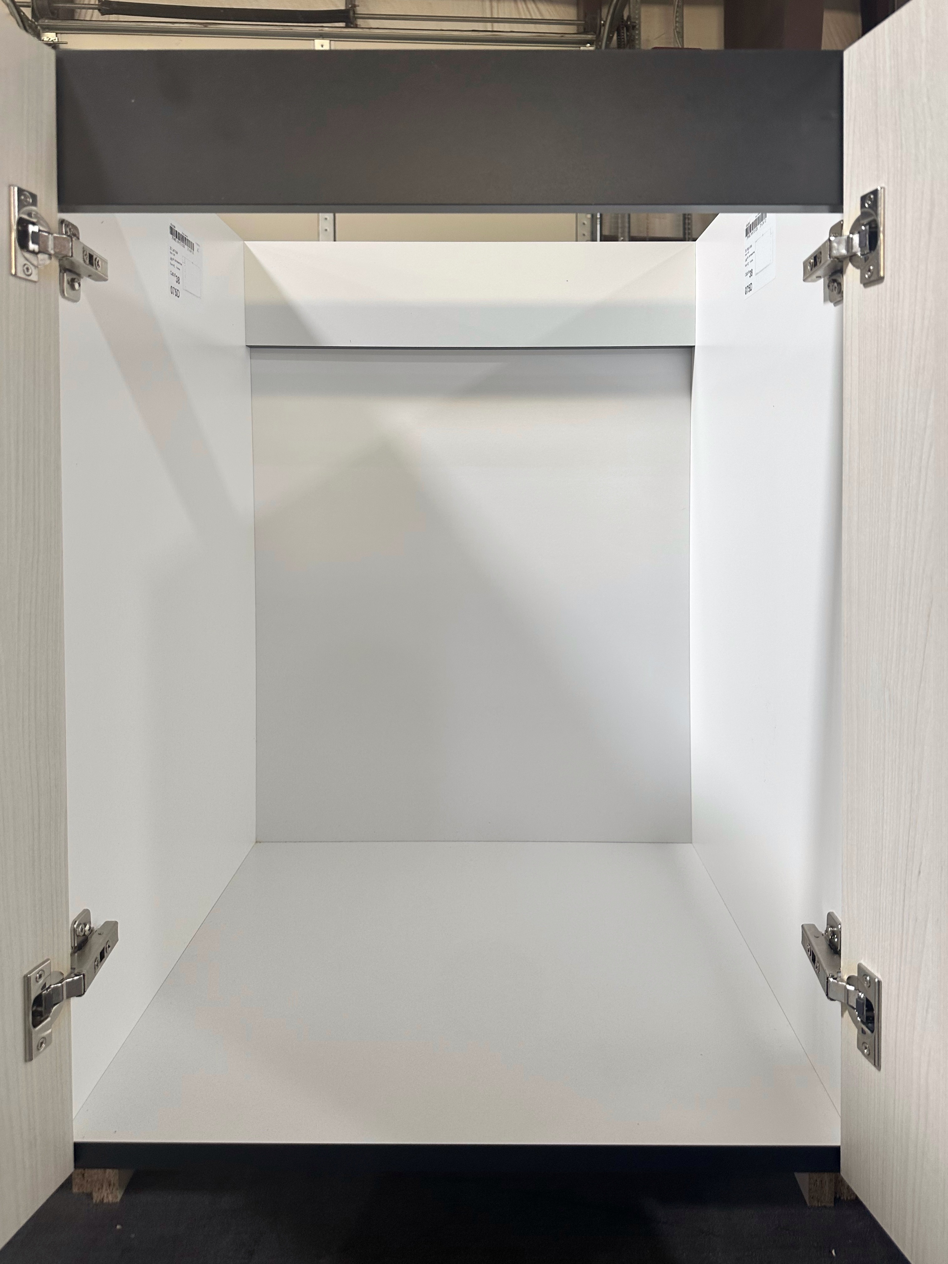 do not change the cabinets in any way preserve the exact cabinet colors materials finishes dimensions door and drawer styles hardware spacing alignment and all geometry exactly as shown do not alter the countertop shape backsplash appliances flooring lighting fixtures or wall structure only remove the construction materials clutter and mess from the scene clean the room and make it look finished and staged add a few simple tasteful home accessories appropriate for the style of the space but do not add or remove any furniture windows or architectural elements maintain the original lighting direction and realism enhance clarity and polish the photo while keeping the cabinetry and room design completely unchanged do not alter the lighting to keep the cabinet colors as they are in the image keep the straight on zoomed perspective as is of just a single base cabinet with applied finished end panels and a countertop stage the inside of the cabinet with cleaning supplies