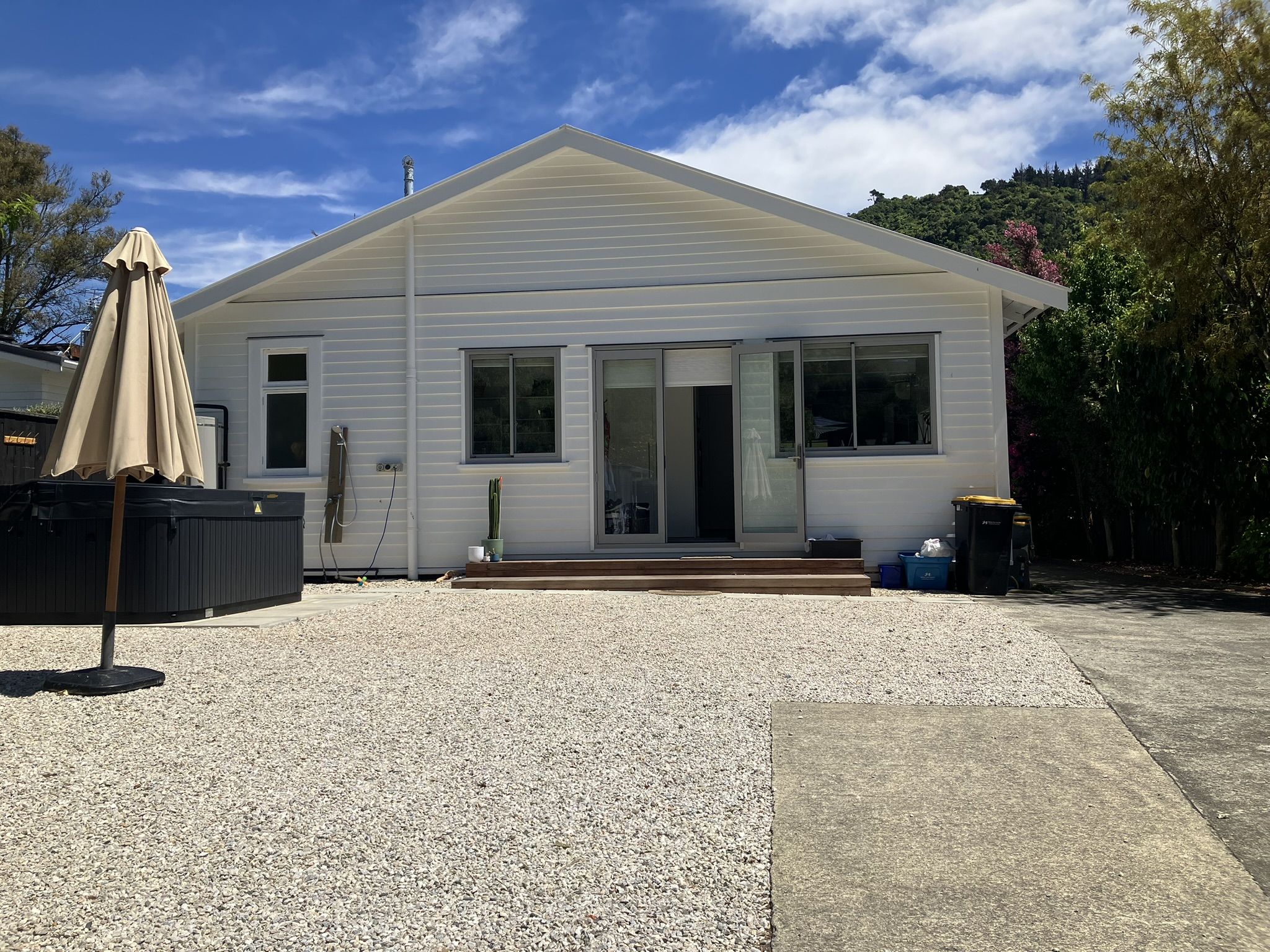 install a large freestanding pergola in front of the house with a kwila deck