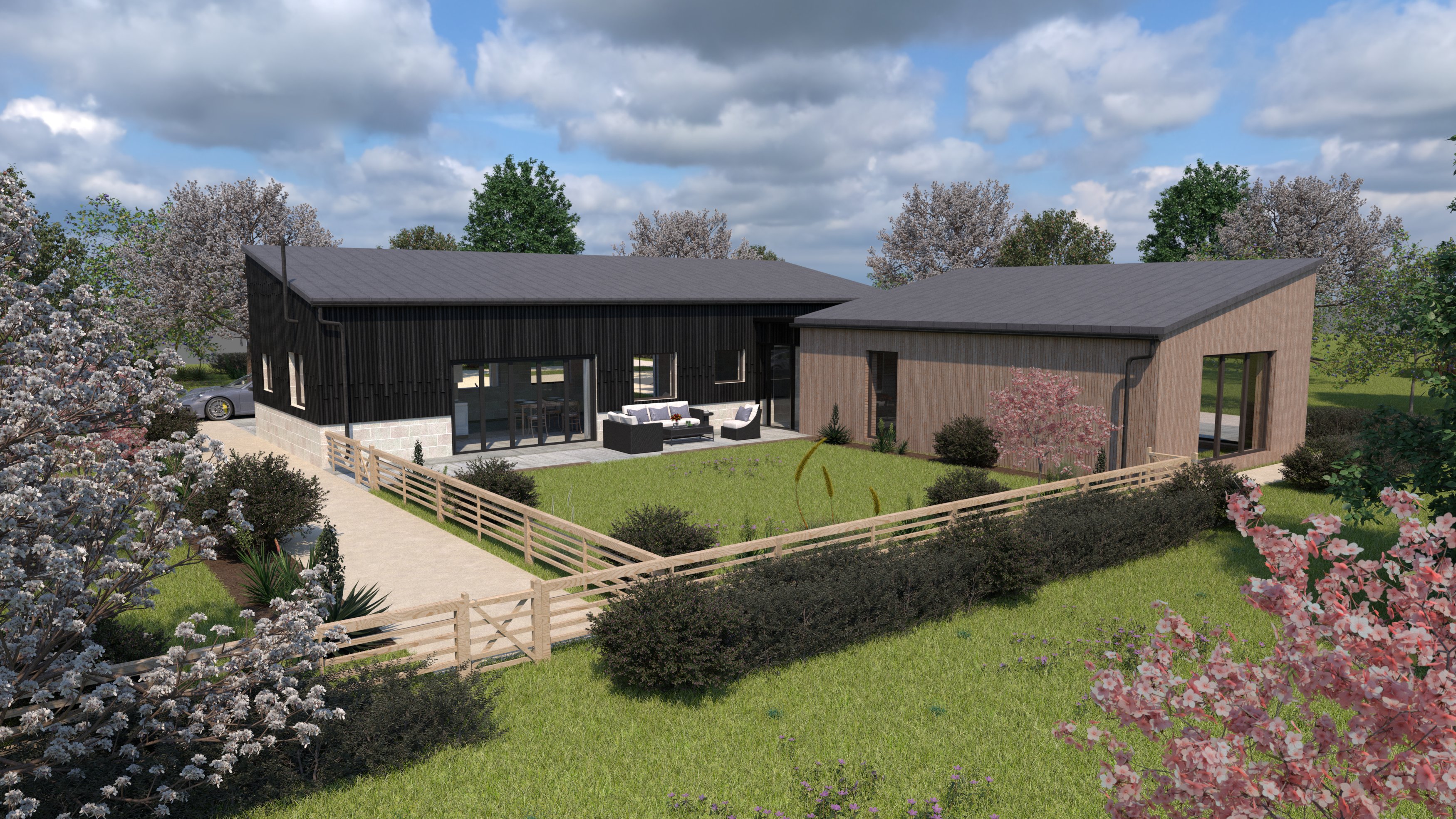 modern farmhouse large black and brown barn style complex with sloped roofs set in lush green surroundings blossoming cherry trees in light pink and white bright green grass lawn wooden fence in light tan a patio area with stylish gray outdoor furniture vibrant and fresh atmosphere partly cloudy sky with patches of blue late springtime ambience