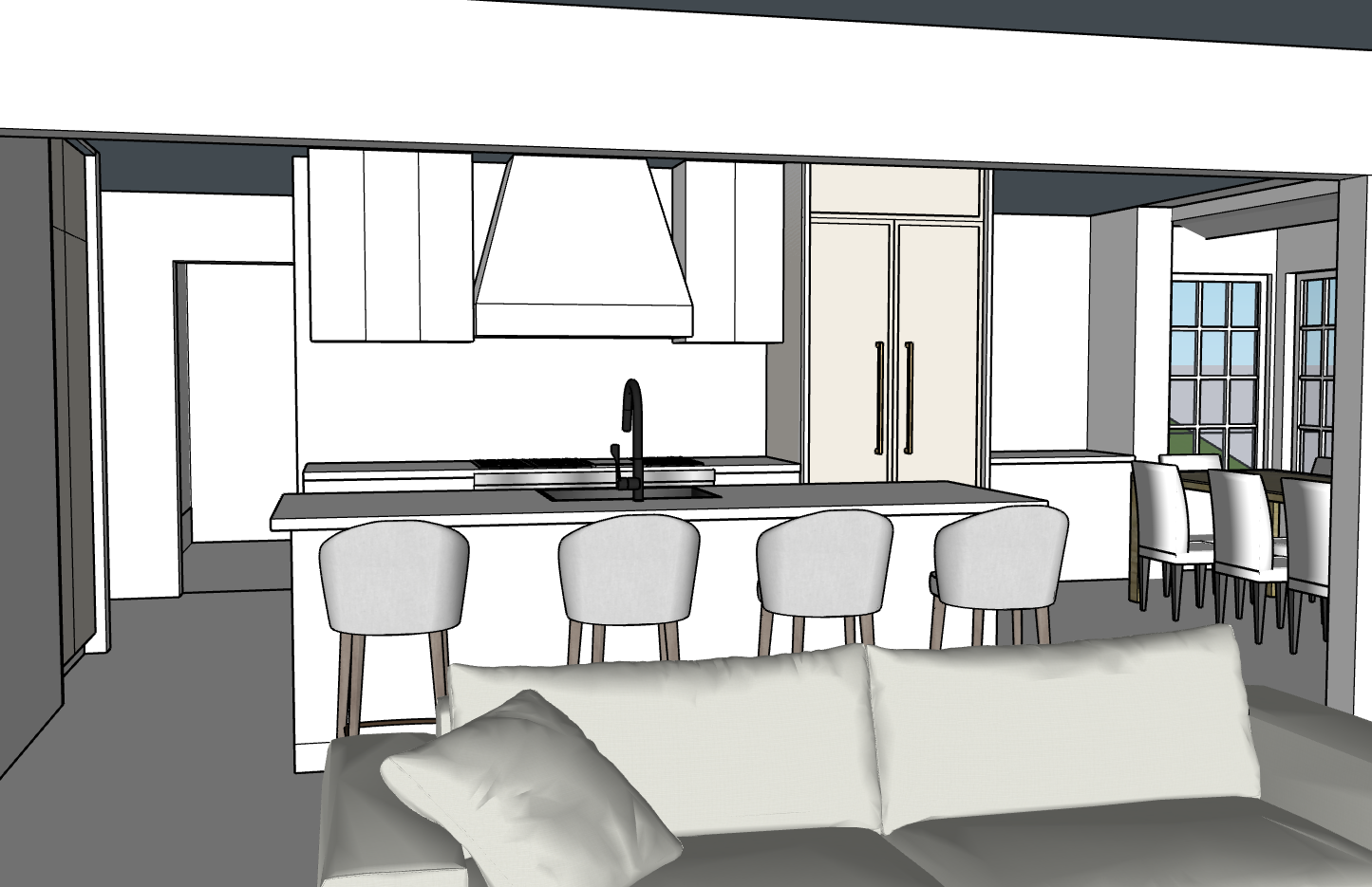make a photorealistic rendering of the interior of a kitchen with traditional touches but modern clean lines show sunlight coming through the windows make the countertops white marble and the backsplash white marble