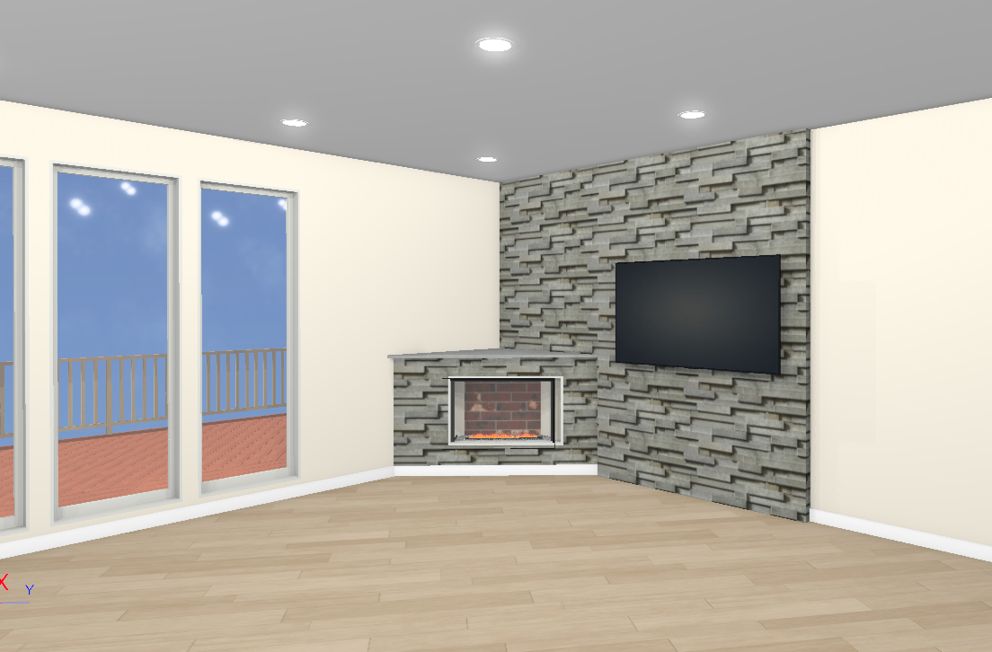 modernist interior shot finish this perspective photo there is ledgestone stone on the right wall and around the fireplace above the fireplace put some art or decorations the rectangle on the right in the stone is a wall mounted tv architecture
