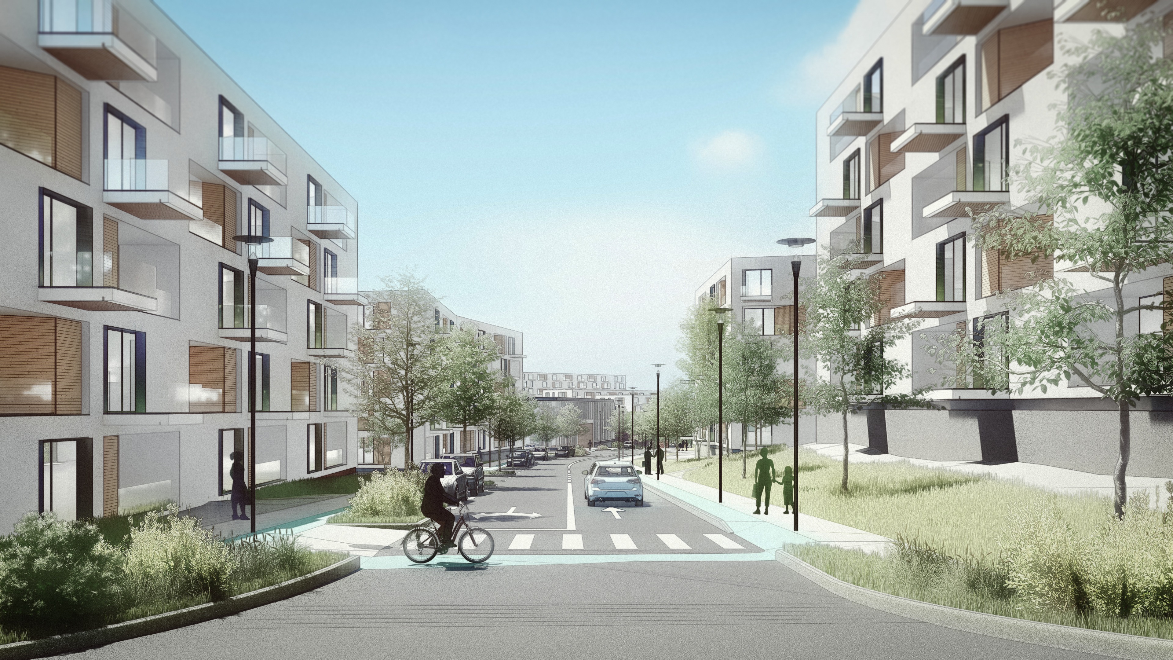 important preserve the existing geometry and the existing context exactly as provided do not modify alter reinterpret add remove scale or reshape any geometry do not change the site surroundings street layout neighboring buildings vegetation or context elements do not modify geometry scale proportions buildings road layout sidewalks or surrounding context in any way do not change text photorealistic architectural rendering clean and balanced contrast calm cinematic mood style contemporary european residential architecture minimalist premium understated delete all people and cars do not alter the church color soft overcast noon atmosphere diffused natural daylight with subtle blue grey tones cinematic architectural mood large glass surfaces with realistic reflections soft mirror effect subtle environmental reflections of sky and surroundings soft wet pavement with soft light bounce and blurred reflections high dynamic range lighting realistic global illumination soft shadows calm and minimalist nordic mood photorealistic architectural visualization balanced exposure no harsh highlights
