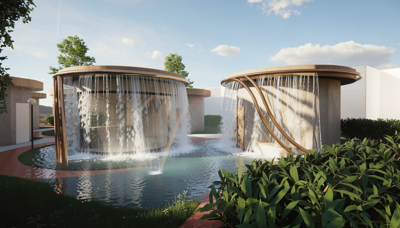 make this image photo realistic with a gentle calming ring of water around the circular building trickling from the copper pipes and draining effectivily so it doesn t look like the garden is floading