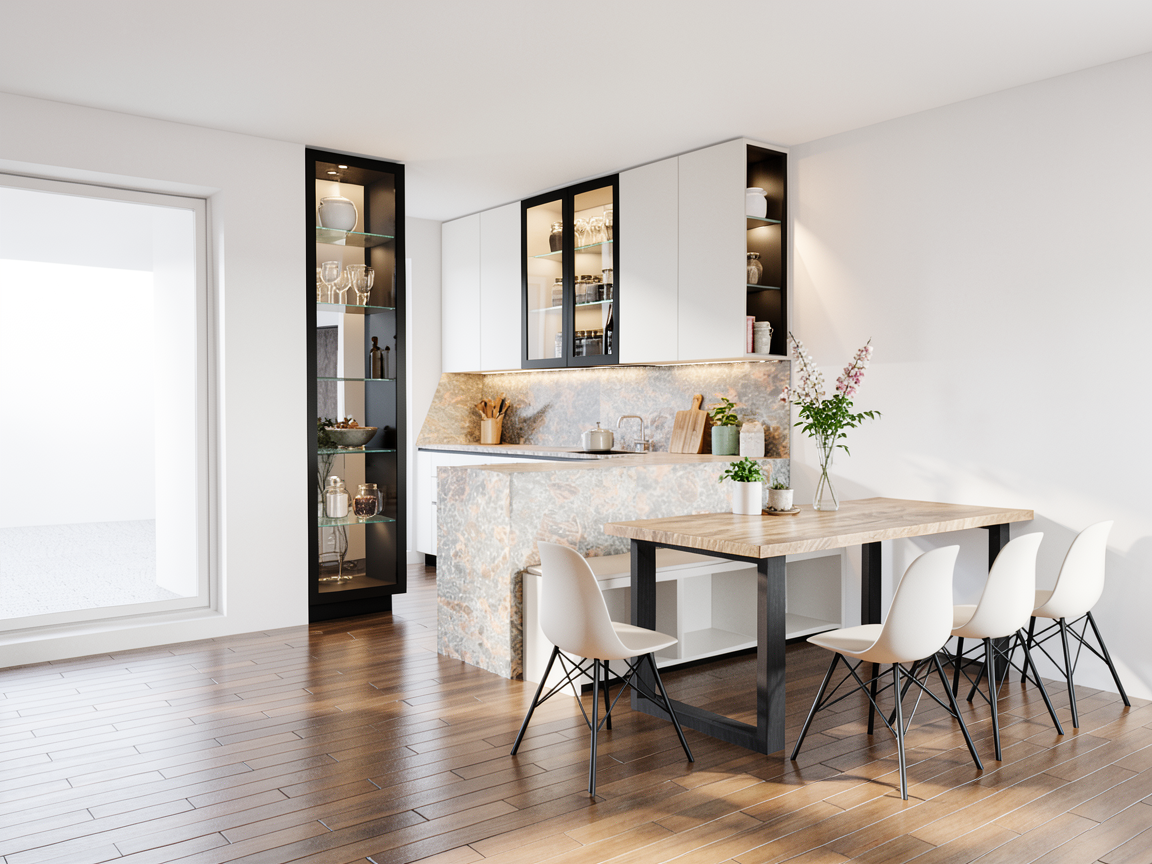 convert this floor plan into a realistic isometric 3d view of a full house show the space from an elevated angle with furniture walls and details visible create a beautiful and detailed 3d rendering of a modern apartment interior based on a floor plan use a neutral color palette with soft whites light grays and beiges for walls and floors add natural wooden textures with warm oak for furniture incorporate plush sofas in a muted gray with cushions in pastel shades like soft pink and light blue design a sleek kitchen with glossy white cabinets and stainless steel appliances highlighted with under cabinet lighting use large windows to allow natural daylight casting a warm and inviting glow the atmosphere should be cozy and modern with indoor plants adding a touch of greenery include contemporary artwork in soft colors for a sophisticated touch use the same furniture as shows on the plan do not change the orientation of the floorplan