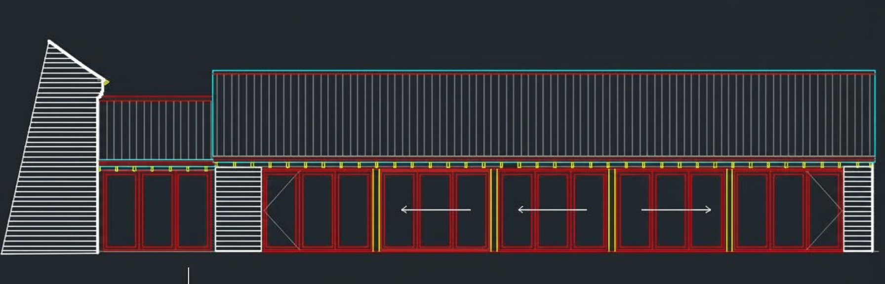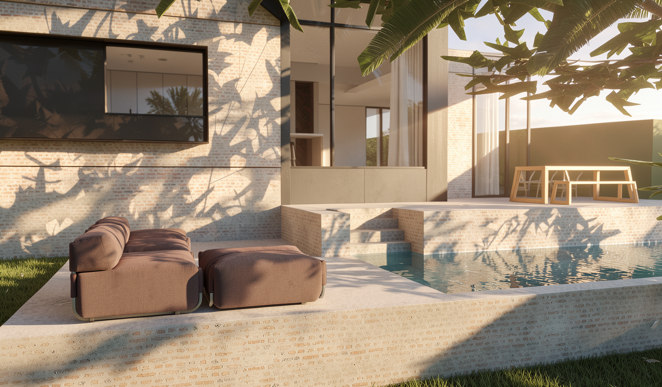a glass balustrade runs to the right of the kitchen well past the kitchen the kitchen sits in the middle of a large patio that is in front and behind the kitchen there needs to the grass to the right of the balustrade but at a lower level there needs to be trees in the distant horizon