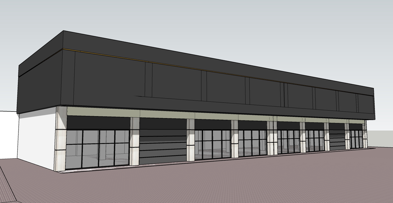 exterior shot warehouse travertine light beige and black colour retail led line facade