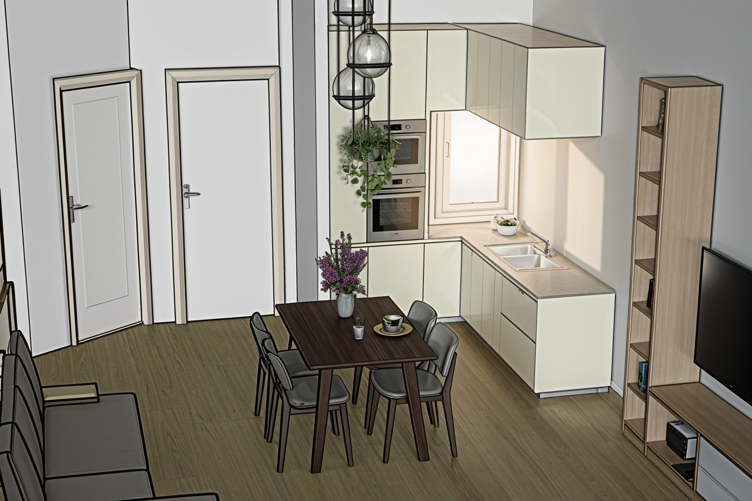 postmodern interior shot kitchen dining room white doors white walls architecture