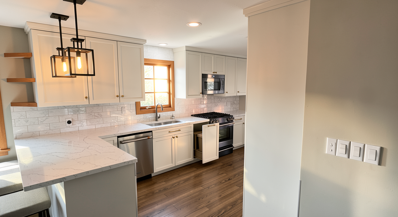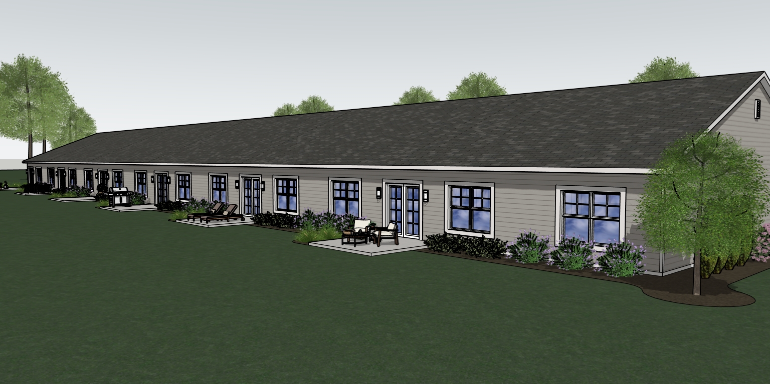 partly cloudy sky some deciduous trees in background taupe siding white windows add gutters and downspouts