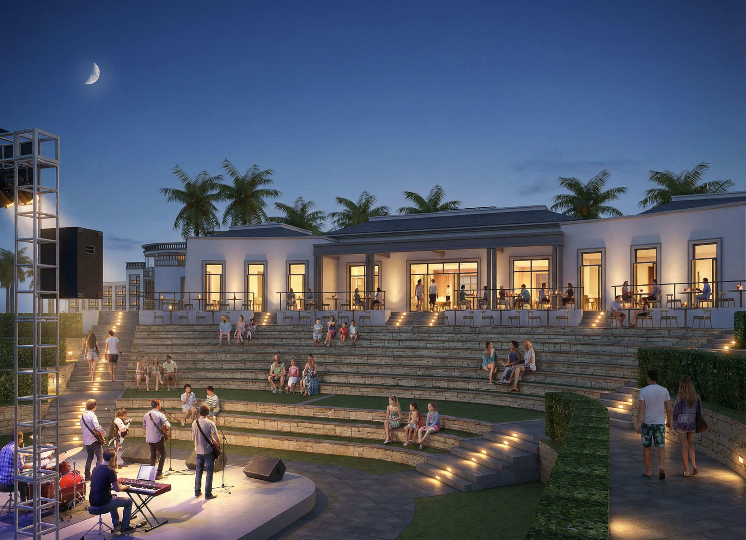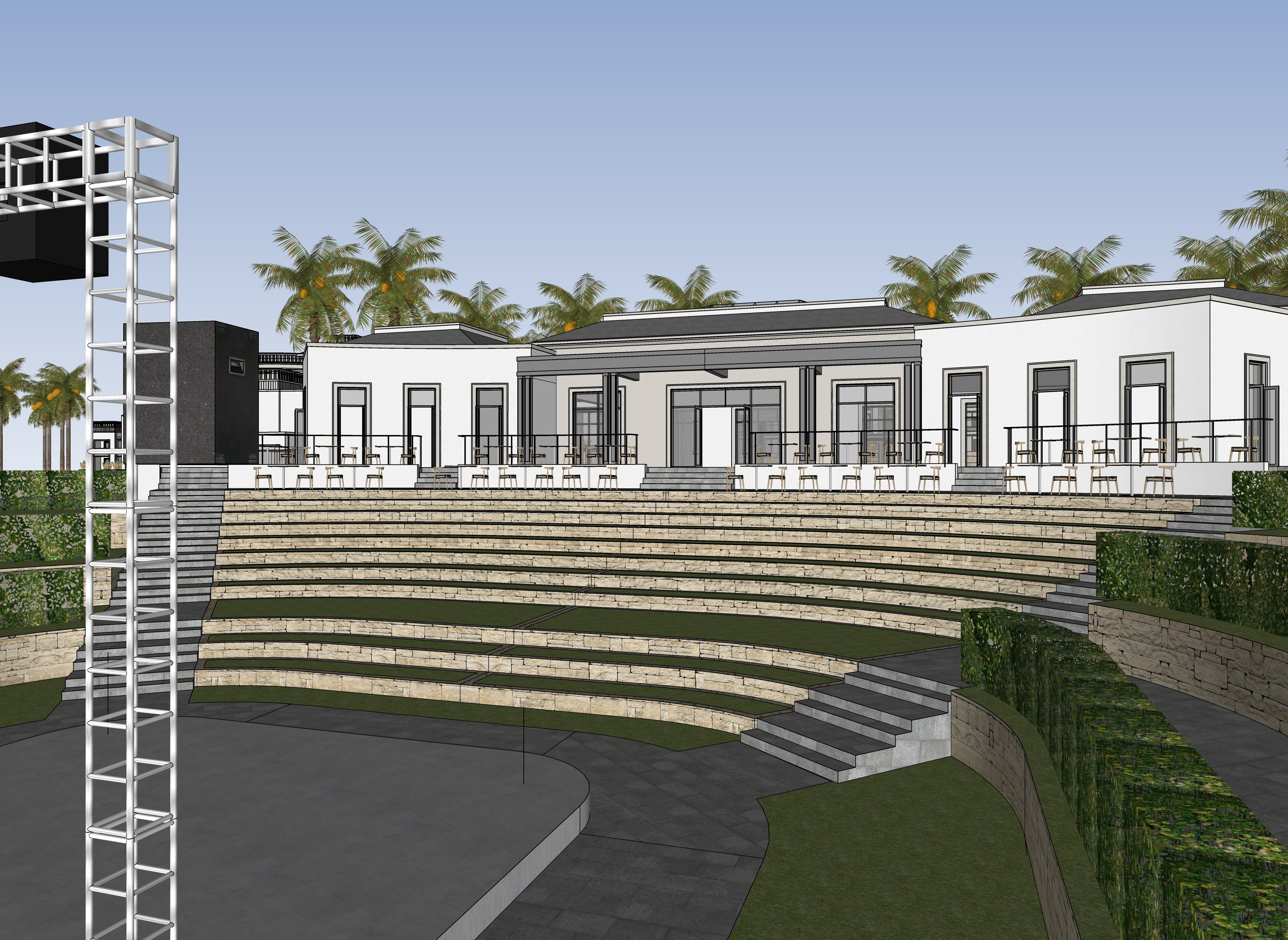 evening view with lights on inside the restaurant fill the amphitheater seating with people and kids dressed in casual resort clothes add some people walking up and down the amphitheater steps enhance the landscaping add some lighting on the stage in the foreground put some contemporary middle eastern musicians men and woman performing on the stage with musical instruments and other performance equipment add spot lights on the stage performers add people sitting at tables on the top level of the theater next to the restaurant building with drinks on the tables watching the stage add a moon in the sky in the upper left corner of the view make the hedges more natural and realistic looking make the inside of the building look like a restaurant inside with mood lighting add step lights to the stairs in the amphitheater add a man and woman walking on the pathway at the lower right side of the view use the architecture in the reference image