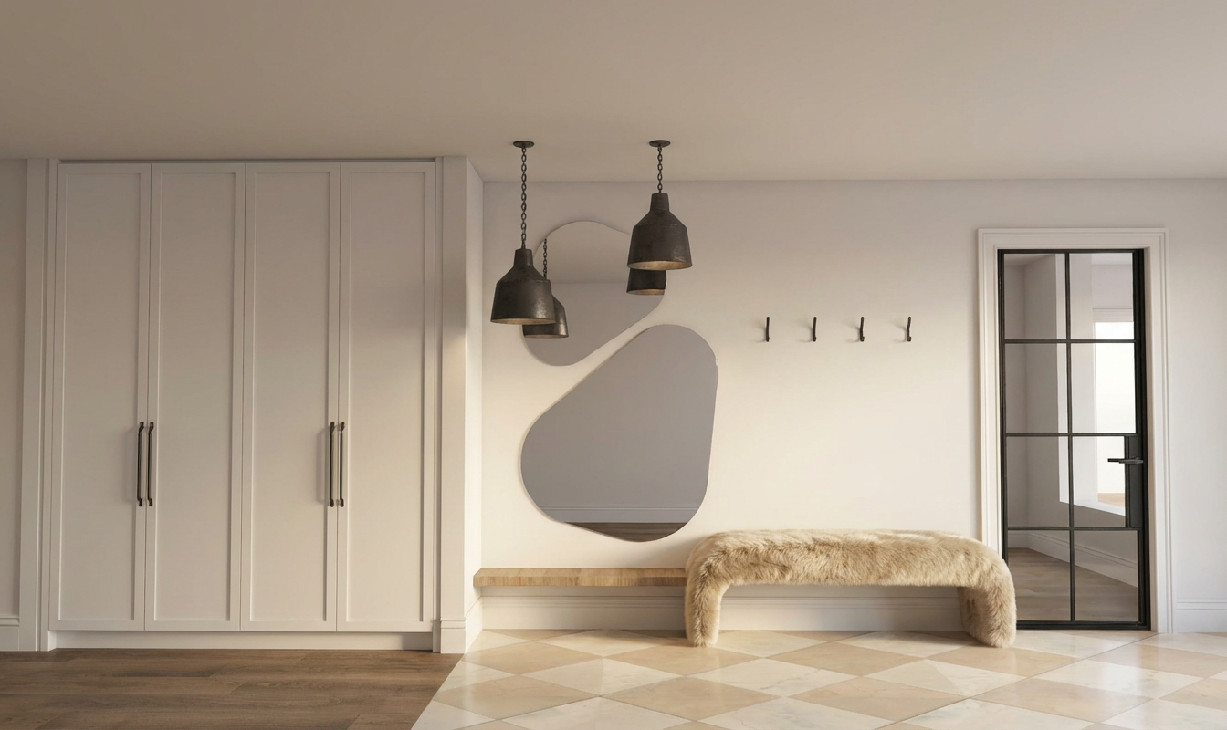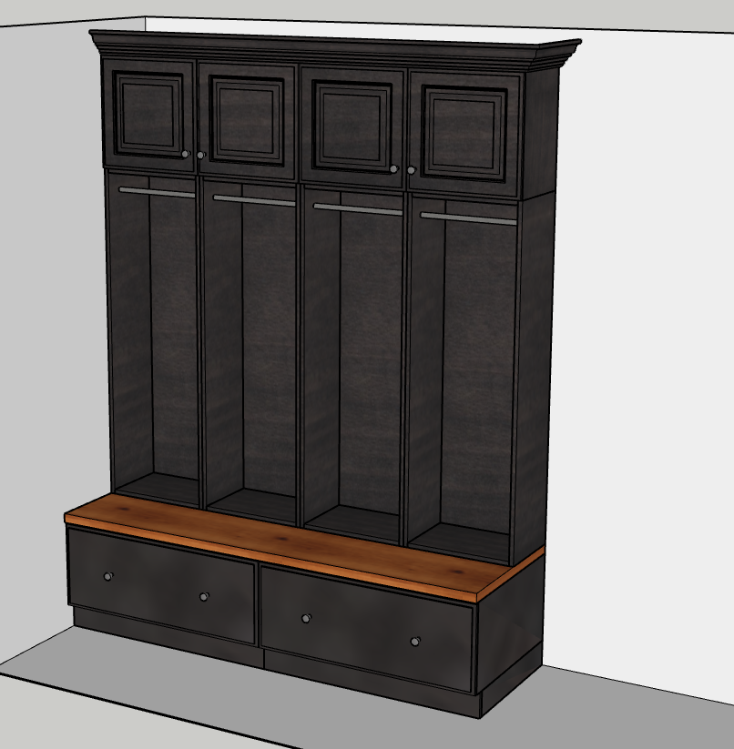 this is a nice little mud room closet area the top of the bench is a natural stained alder with a toffee glaze the cabinets are a dark stained alder each of the locker cabinets has a brushed nickel closet rod the floor is an off white tile