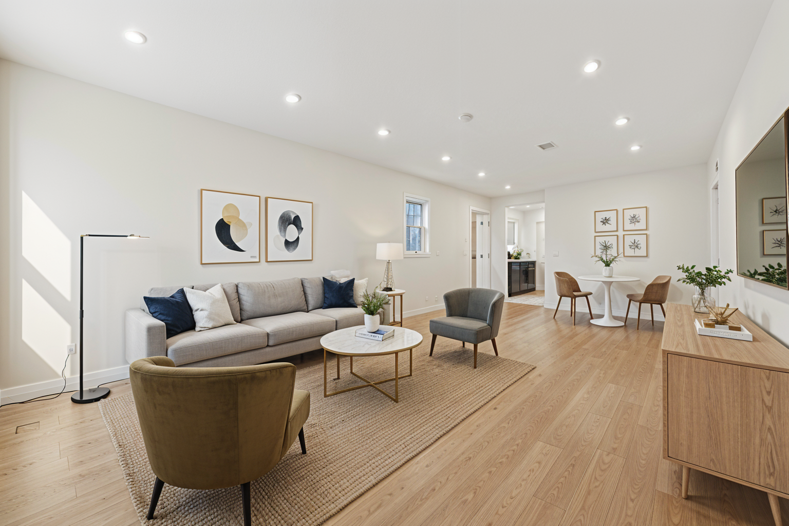 retain the build of the home retain the window placement wall placements living room in the foreground and little dinette down the hallway with two chairs and small table like a bistro set