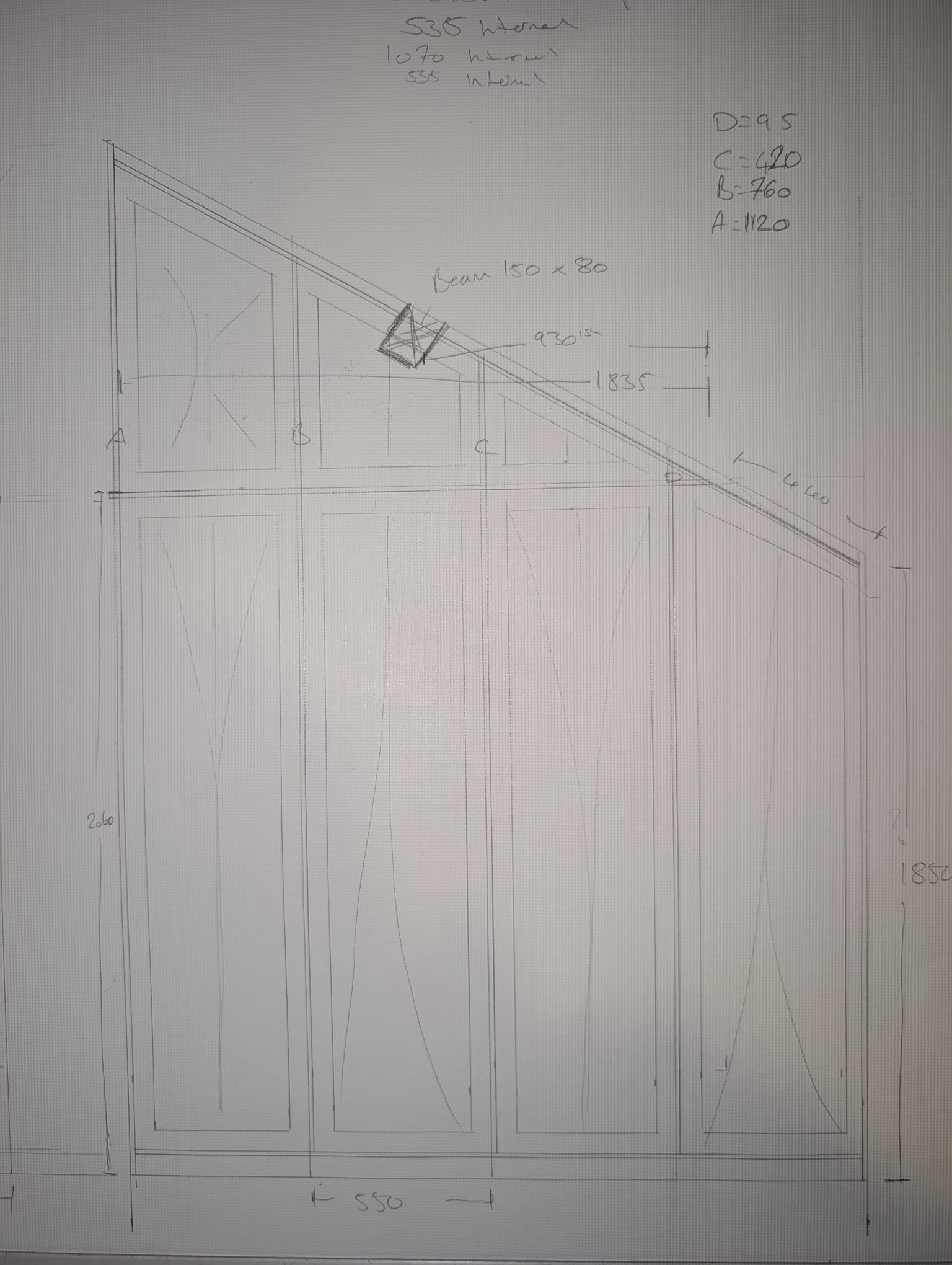 make a photorealistic render of a wardrobe fit into the shape of the roof of a barn converted house the wardrobe is in the bedroom there is a structural beam running down the ceiling