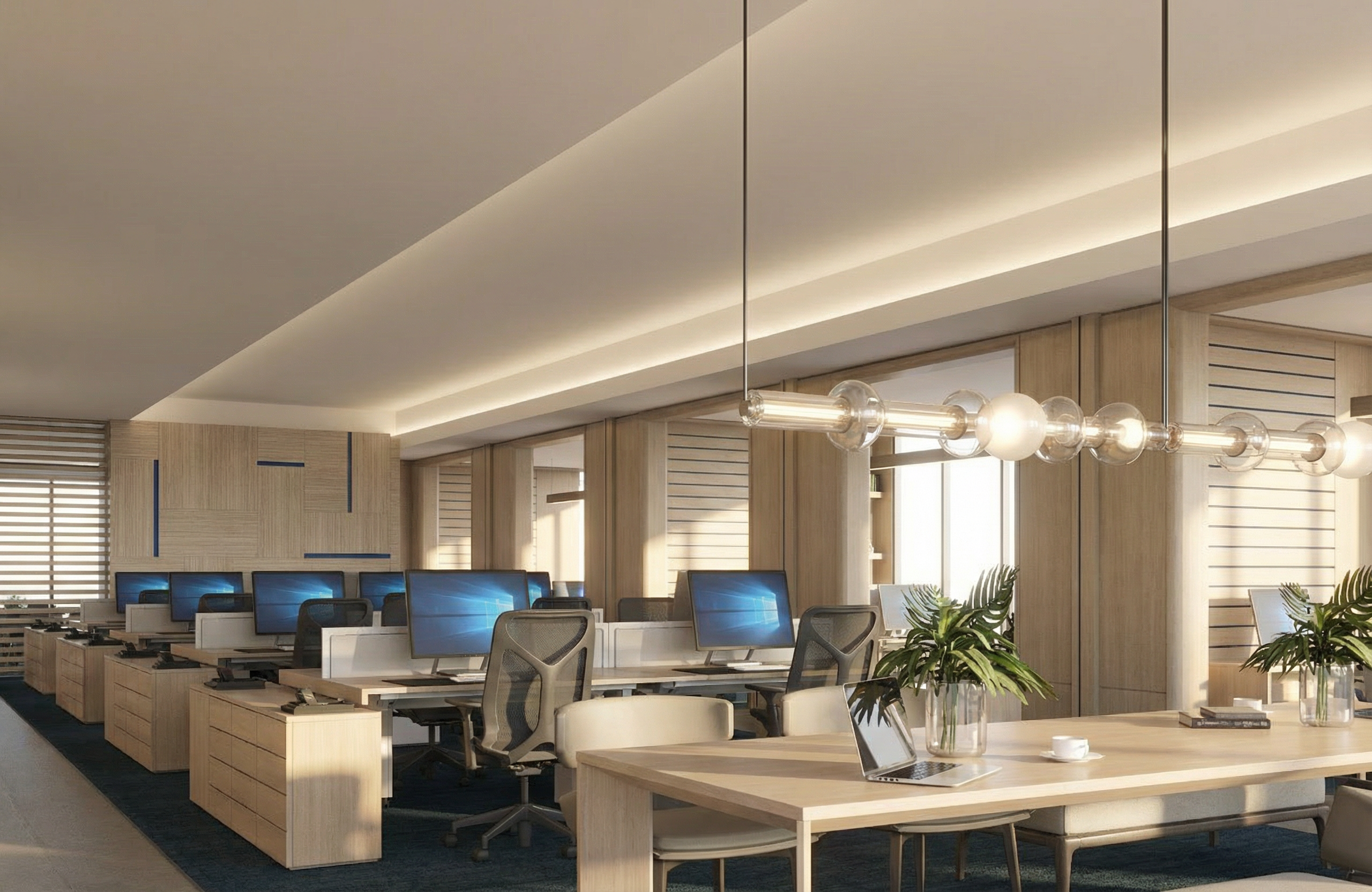 photorealistic interior top down view of floorplan with warm orange color on top of areas polished concrete floors white walls and light metal orange finishes the space is lit up with soft soft lights bright lighting and overall environment is soft bright lighting