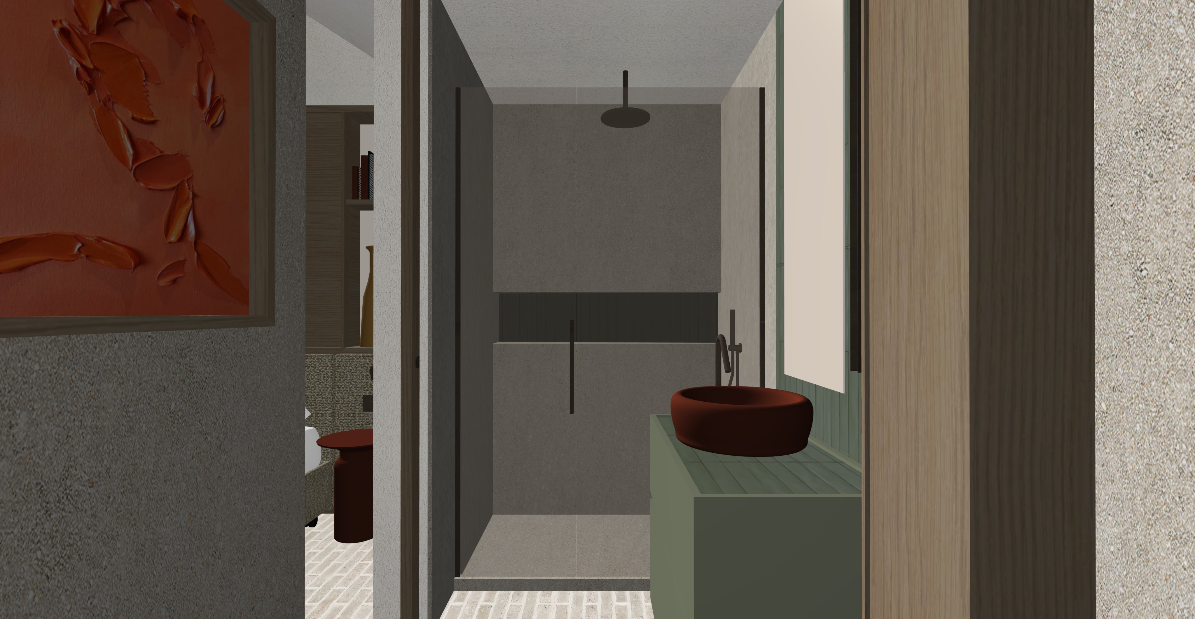 il soffitto intonacato bianco caldo con texture come muri esterni ceramica lavabo rosso ruggine scura lucida legno rovere come texture immagine leggermente spazzolato mantieni texture immagine a pavimento mobile lavabo laccato verde salvia opaco la nicchia stretta e lunga nella doccia ha tre microspot incassati posizionati tutti a sinistra il fondo della nicchia con libri e vasi in specchio il comodino in camera laccato lucido rosso ruggine scuro il fondo della nicchia in piastrelle verdi opache color salvia