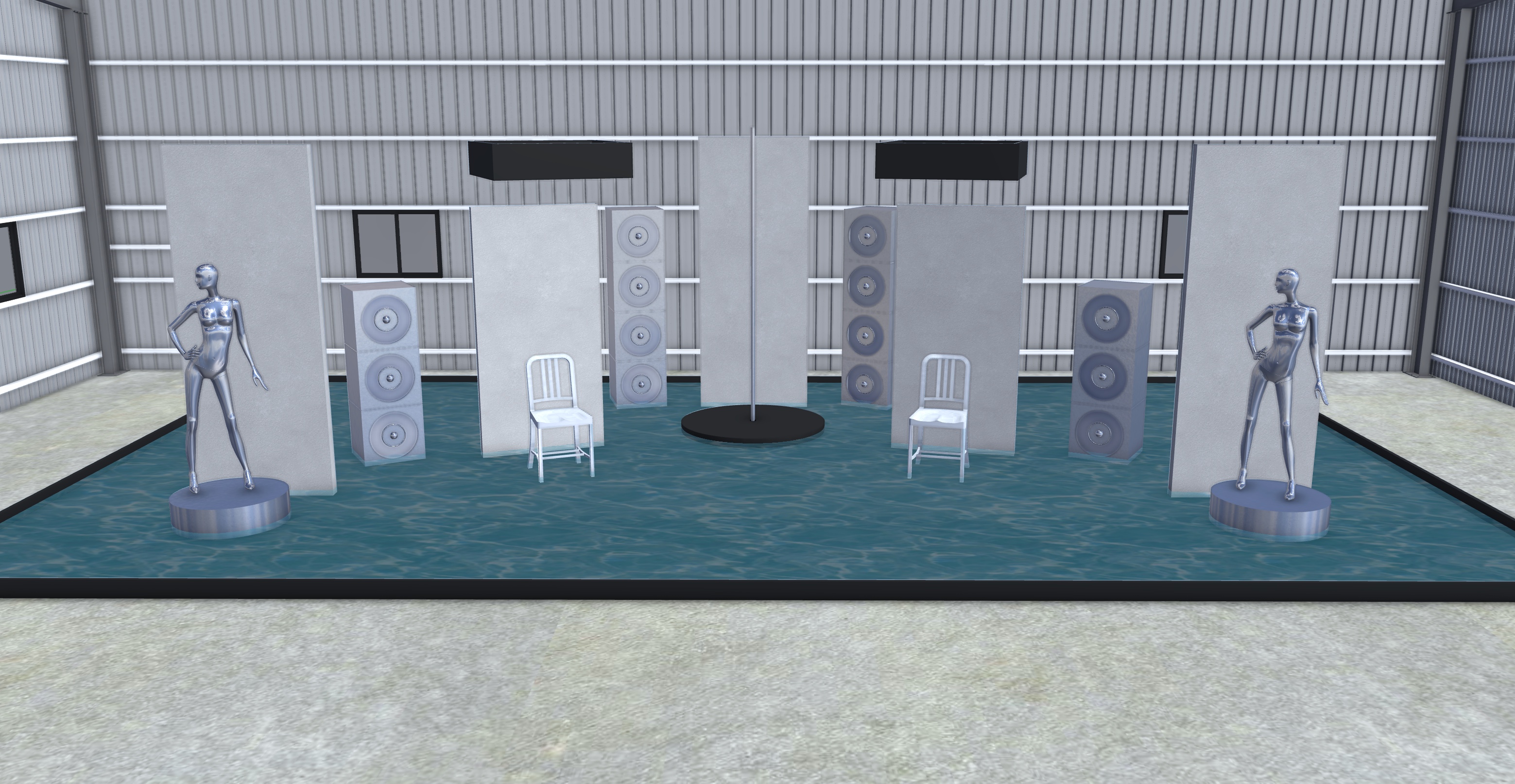 i don t want you to change anything about this objects in the picture i want it to be night time with some fog in the air i want you to include a spotlight above each wall