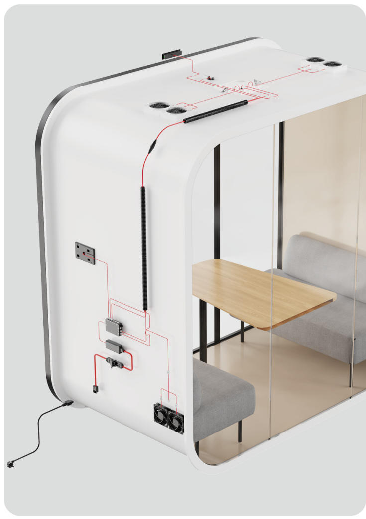precise product technical visualization exact base acoustic meeting pod from reference matte white rounded corner exterior side panel dark charcoal aluminum frame with rounded edges three panel full height glass sliding doors bronze vertical door handle light gray acoustic felt interior wall lining visible through glass dual led strip lights on interior ceiling red corner accent top right exterior slim indicator light on right side panel adjustable leveling feet at base corners pure white right side panel large flat surface add wiring system onto right white side panel exactly replicating image 1 circuit layout top section of white panel two black square ventilation fans mounted at top side by side recessed flush red wiring traces emerging from fans precise circuit line paths drawn on white surface thin red lines routing downward in organized paths vertical cable management one black corrugated flexible conduit tube running vertically down panel left side approximately 60 of panel height attached with small black cable clips at intervals red wiring running alongside conduit mid panel control modules three black rectangular electronic module boxes stacked vertically in column upper larger square module with visible connectors middle medium control box lower smaller terminal block unit all connected by red wiring traces circuit lines branching between modules precisely mounting screws visible at each corner lower panel two black square cooling fans side by side mounted near base of panel connected by red wire traces to module stack above ventilation grille pattern on each fan face power output single black power cable with connector plug exiting from bottom edge of panel cable draping naturally downward wiring aesthetic all red circuit trace lines clean and precise right angle routing no diagonal lines traces 1 5mm width bright red color on pure white panel surface high contrast engineering diagram quality but rendered as actual physical product photography rendering quality same 3 4 front left angle as base product image pure white studio background even professional studio lighting all wiring components physically real and tactile not diagram overlay but actual mounted hardware white panel surface showing slight shadow beneath each mounted component 8k ultra hd apple or dyson product page quality every component and wire route sharply rendered ar 4 3 style raw stylize 160 q 2 v 7