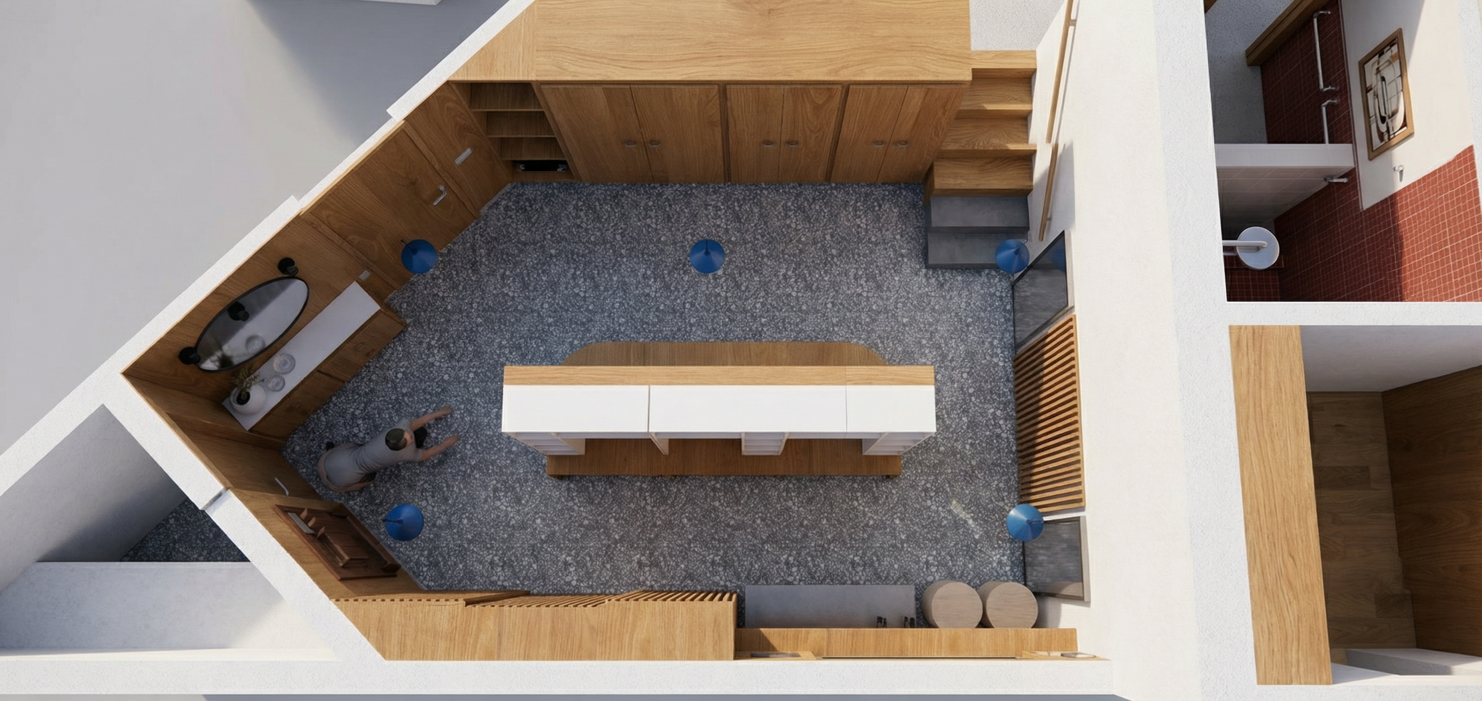 add two story deck on building both buildings and make buildings black black windows add porch on center building make porches black