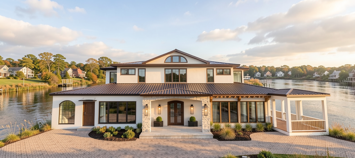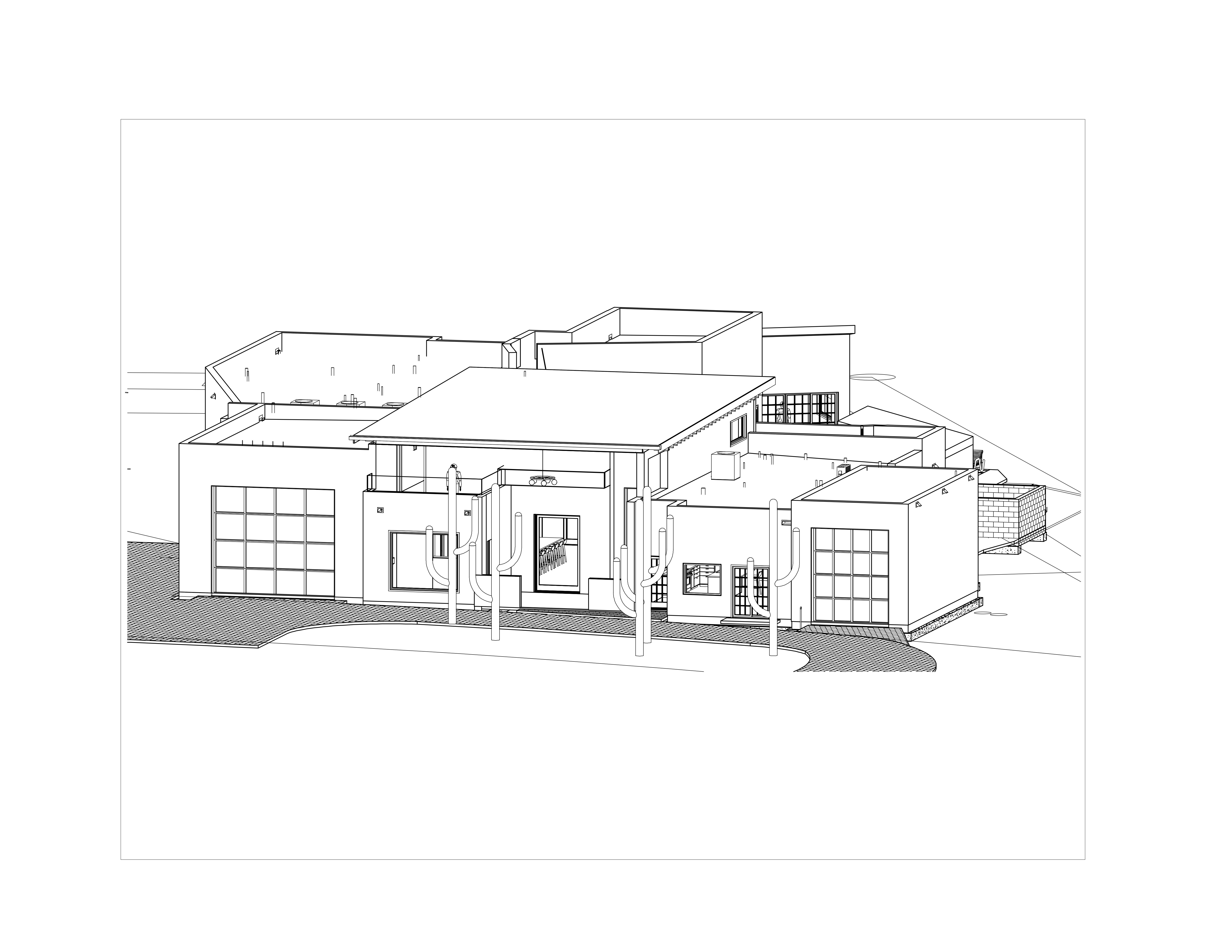 black metals roof only on the center mass building with a tilted roof clad this mass in stucco all other flat roofs will be in the sand stucco the two end masses are garages clad the left garage in stone and clad the right garage in the wood cladding add the stone ledge cladding to the two front masses with the windows these are next to the garages i have attached a moodboard with the materials for your reference do not edit the building structurally only add the exterior architectural materials