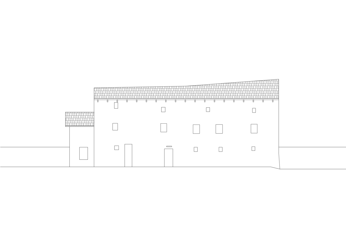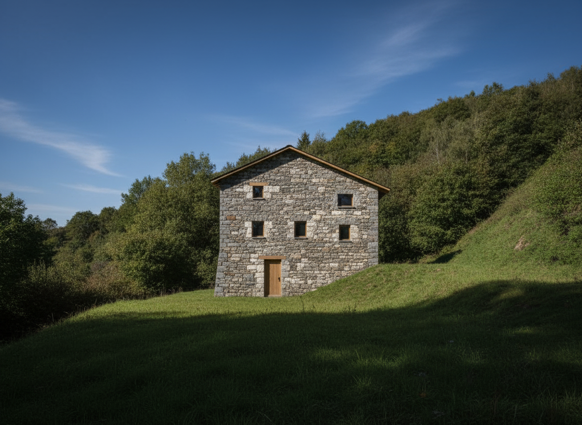 create an architectural elevation of the attached image do not crop or resize the house vertically or horizontally the full elevation must remain visible do not alter the design only apply the materials and fill the exterior with nature the material of the walls are natural rock bricks random mix of grey cream and light brown tones with over grouted mortar the roof is made with dark black slate roof seam the under roof beams are mad of oak wood the gaps in the wall are all windows with glass the exterior is all greenery all around the structure the ground is full of with grass and the upper part of the background with a steep hill side full of trees preserve all existing windows keep the overall rendering slightly on the darker moody side for realism