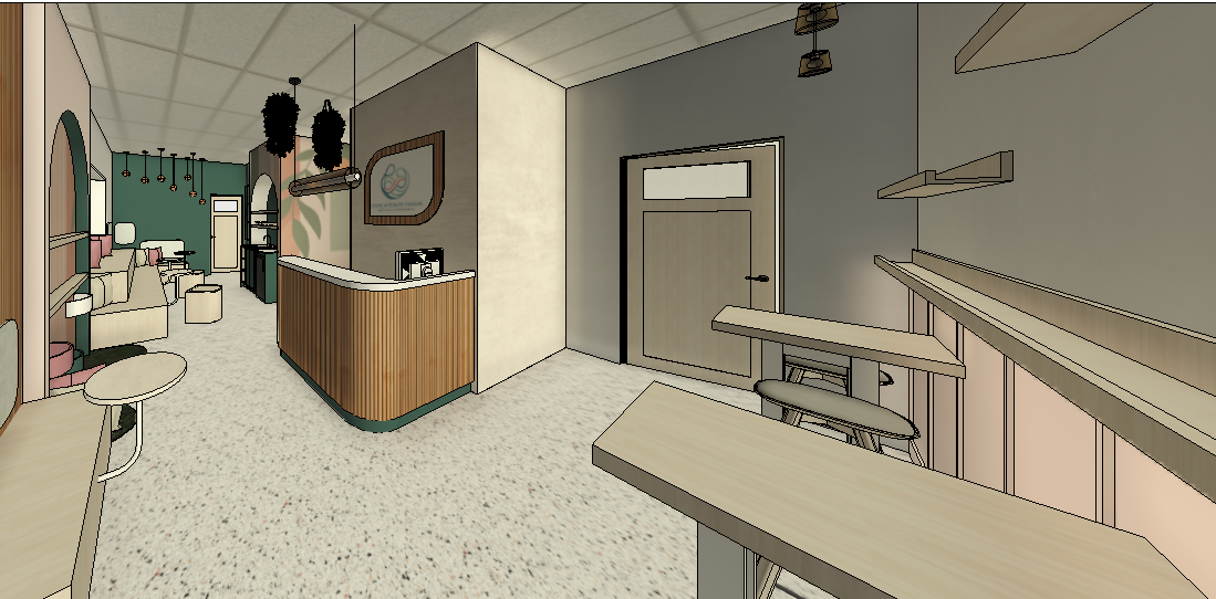 absolument c est un point crucial pour s assurer que l ia ne r organise pas l espace de mani re al atoire lors du rendu voici le prompt final pour archsynth en insistant sur la disposition fixe des l ments tout en conservant le focus sur les textures de bois profil et la peinture la chaux sans mention de couleurs prompt pour archsynth texte copier coller interior design photograph of a modern medical clinic interior with a fixed and precisely arranged layout designed with a comforting yet joyful and inviting trendy caf aesthetic the atmosphere feels optimistic utilizing a cohesive selection of natural textures and abundant daylight it is imperative that all specific spatial elements remain exactly in their designated locations the main reception desk backed by a feature wall finished in tactile textured lime wash paint peinture la chaux and wrapped in light wood tambour slatted wood profile is positioned at the entry the adjacent primary waiting area features a raised platform estrade made of light wood integrated permanently alongside a large floor to ceiling window overlooking a peaceful courtyard the platform is adorned with comfortable plush bench seating and soft textured cushions nearby several small minimalist light wood work tables with stylish chairs made of bentwood profiles offer charging stations a dedicated children s corner is fixed nearby marked by a distinctive green artificial grass texture rug filled with simple tactile wooden toys and a large abstract mural focused on organic textures separated by a partial glass and wood slat screen is the staff break room and kitchenette this area includes a sleek light wood kitchenette with white cabinetry and open shelves a large communal lunch table made of pale solid wood and an integrated well stocked library bookshelf unit built directly into the wall adjacent to the lunch table the overall space uses natural textures soft diffused lighting and plenty of large lush potted plants the main floor is smooth light polished concrete high resolution realistic render architectural photography style natural daylighting intimate and welcoming composition