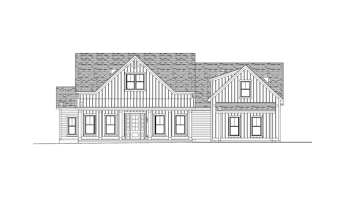 make this front elevation photorealistic while keeping textures and architectural elements the same as selection add professional landscaping on a lightly wooded scene with good lighting that is in beaufort south carolina use the following colors and materials board and batten siding to be contented bcc1b4 in color lap siding to be contented bcc1b4 in color corner boards to be white edece6 in color shingle roofs are to be certainteed dimensional shingles in moire black standing seam metal porch roof to be matte black in color windows to be white in color window trim to be white edece6 in color fascia soffit gutter and downspouts to be white edece6 in color frieze boards are to be white edece6 in color exterior lights to be progress lighting east haven exterior lights black in color foundation to be poured wall tabby concrete entry door to be stained dark walnut a medium to dark brown with a rich warm tone entry door sidelites to be stained dark walnut a medium to dark brown with a rich warm tone entry door trim to be white edece6 in color porch columns to be white edece6 in color maintain grade shown in the selection