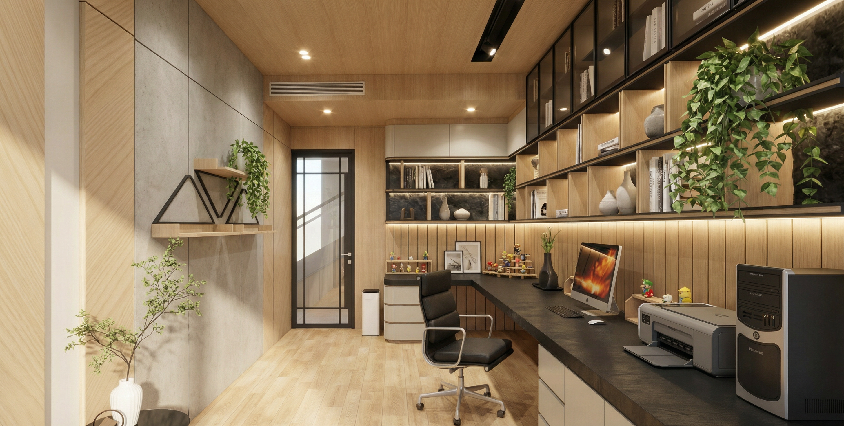 make a photo realistic render change the herring bone flooring to an off white multi loop level carpet brighten up the white tiles up to 30 create a matte finish for the wood with a lighter tone up to 60 help me change rug to blue colours uplight the front of white tiles that are in matte finishes from the strip floor lighting create backlit lighting for the word amara the end of the corridor is a tinted glass door the panel behind the screen is wood laminate this is a confined space no sunlight in the render cove lighting from the side of the ceiling illuminating the ceiling the top of ceiling for the recessed area is in blue finish