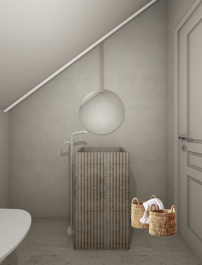 the space is illuminated exclusively by a linear light fixture integrated into the sloped ceiling the fixture has a slim 3 cm profile and provides soft even lighting that gently fills the space it is the only light source in the room the sink is made of travertine marble with a front surface featuring subtle linear grooves adding texture and depth the wall is finished in a light beige microcement with a soft and visually lightweight appearance there is a circular mirror slightly larger in scale enhancing the sense of space above it a thin vertical wooden slat extends from the top of the mirror up to the ceiling adding a subtle architectural detail on the right side there are woven straw baskets placed directly on the floor they appear slightly taller adding a natural and relaxed touch to the space the overall atmosphere is calm minimal and refined with natural materials and a clean architectural aesthetic
