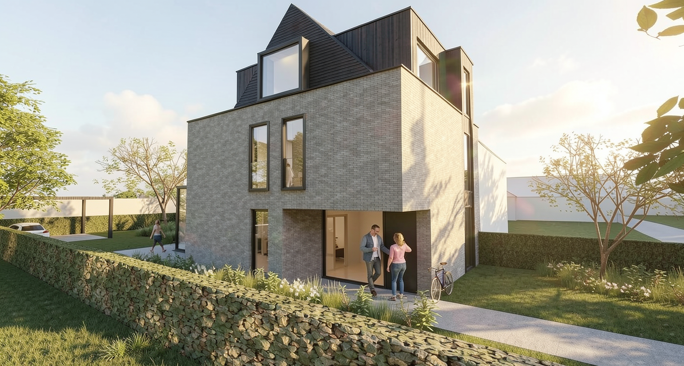 lot of reflects and sun light the sun illuminates the facade that we see some trees in the background facade more in the light more reflect all is painted no stone the fence call is beige like the extension more shadows of trees on the facade my point of view more lighter more tree shadows on the facade different color on each part of the house the left part of the house is beige color add olive trees in pots inside the fence the house on the right is clearer the windows on the left part of the house has no guardrails windows are ral 7030 beige more shadows and reflects in the windows