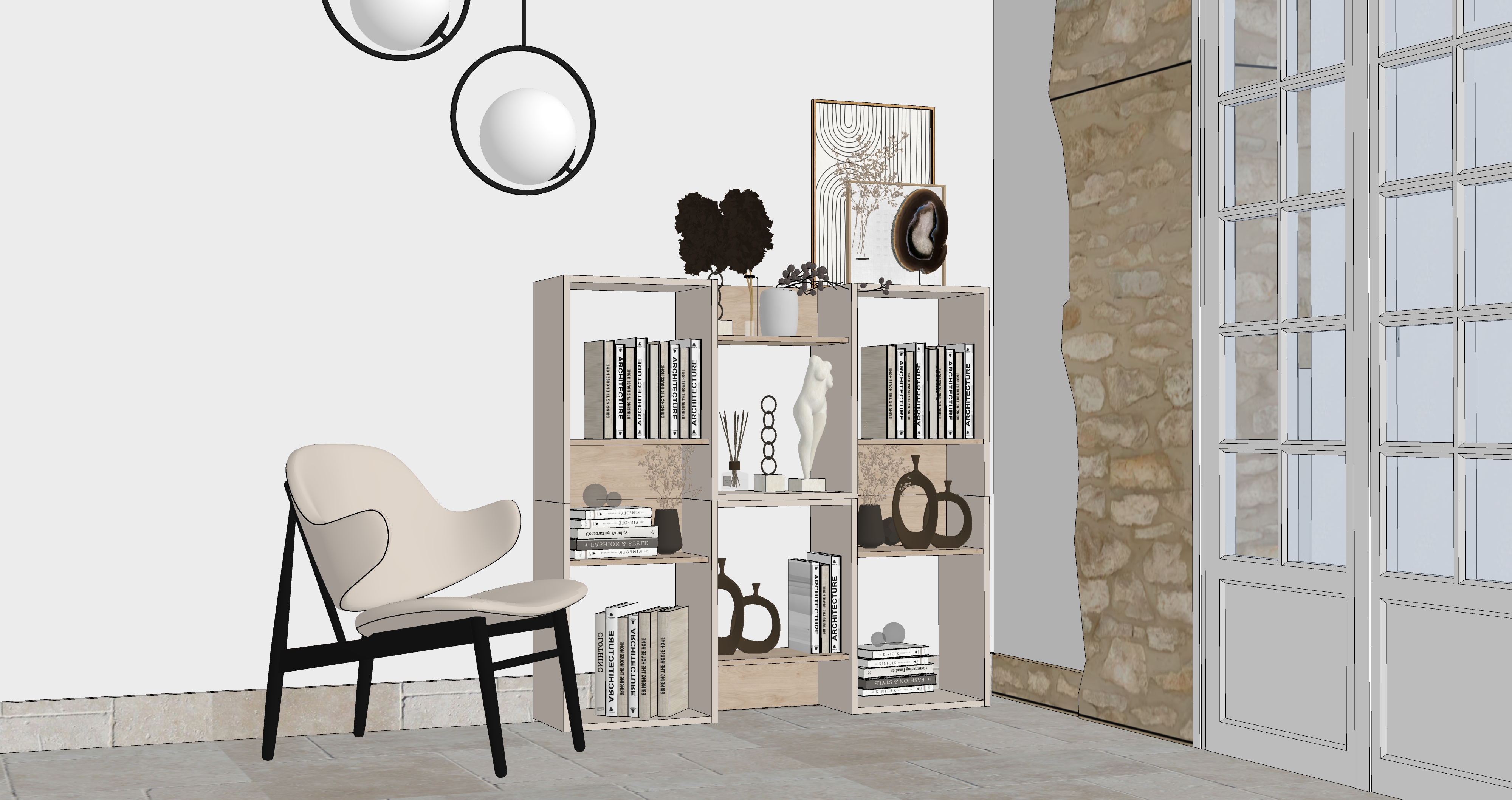 int rieur au design moderne et naturel salon haut de gamme avec un mur blanc avec texture mobilier minimaliste en mat riaux art d co fauteuil en tissus beige doux avec coussins blanc lumi re naturelle douce entrant par de grandes baies vitr es du sol au plafond situ es droite cr ant des ombres subtiles et une illumination quilibr e lampe allum es sur la droite pendant du plafond en verre fum finition cachemire uni satin pour les meubles ajoute des bouquets de plante s cher dans des pot de terre cuite blanc beige gris de forme art deco textures ultra d taill es rendu photor aliste r solution 8k mat riaux ultra pr cis clairage physique r aliste palette de tons chauds ambiance contemporaine et sereine sol en pierre claire