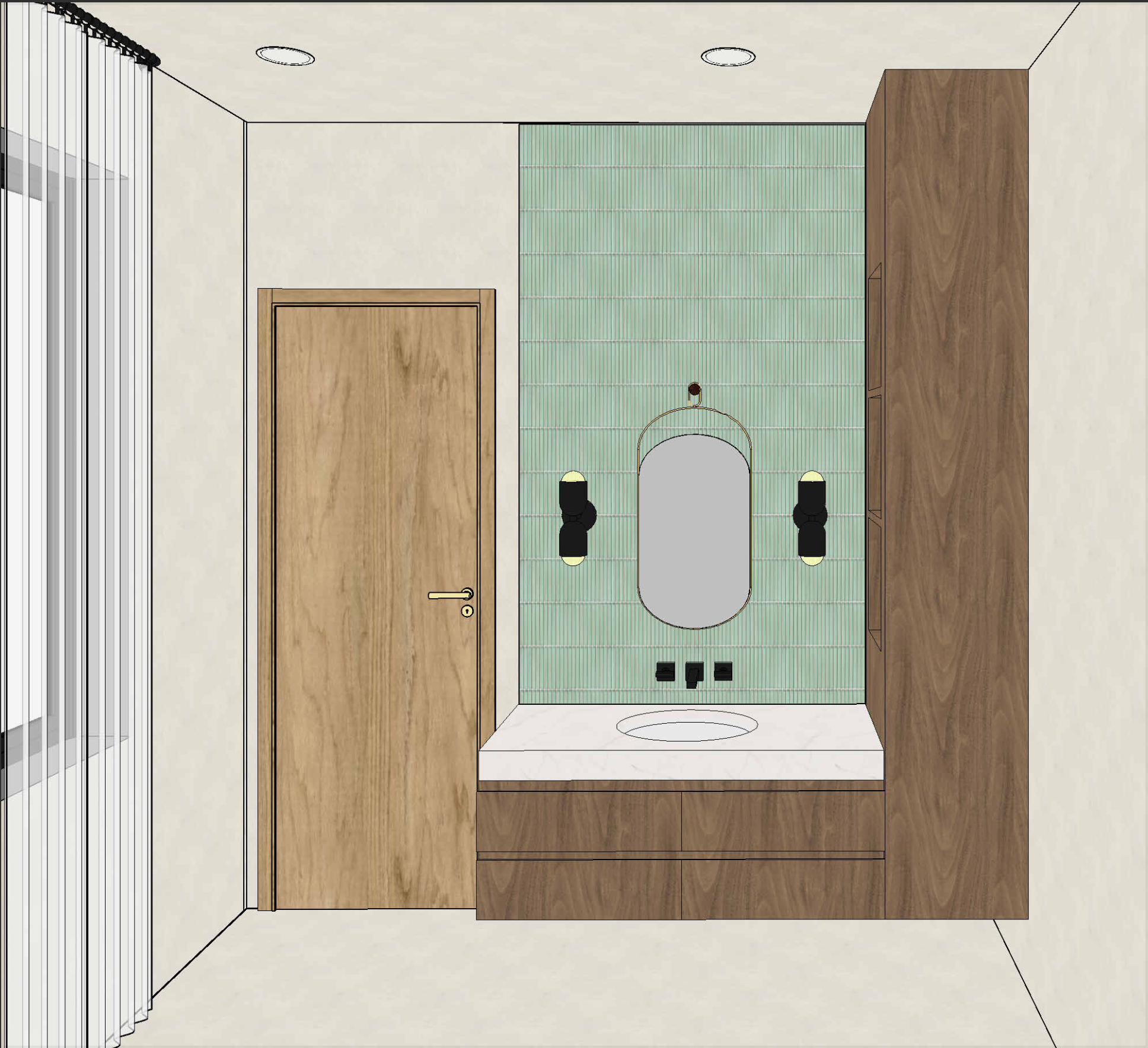 ultra realistic interior render of a modern bathroom vanity scene strictly match the reference image in layout proportions and composition no redesign no added or removed elements maintain exact placement and scale of single sink vanity centered on the wall oval vertical mirror with thin metal frame two symmetrical black wall sconces on both sides of the mirror wooden door on the left side with natural light oak finish and simple handle full height wood panel storage unit on the right side in warm walnut tone sheer curtains on the far left edge two recessed ceiling lights aligned as shown backsplash material same as the reference walls matte finish subtle stone like texture not glossy not ceramic tile look soft beige tone matching the original color clearly visible slab joints horizontal and vertical grid based on 60x120 proportions very thin grout lines vanity details floating vanity in warm walnut wood light neutral countertop with integrated sink minimal modern black faucet centered below mirror lighting soft realistic warm lighting 3500k wall sconces softly illuminating the wall subtle ceiling light contribution no dramatic shadows keep it natural and architectural rendering style photorealistic high end interior visualization preserve all original materials and colors exactly except for backsplash upgrade emphasize texture realism wood grain matte stone surface fabric curtains clean sharp edges no distortion portfolio quality resolution high detail soft global illumination camera straight on elevation view eye level perspective no lens distortion