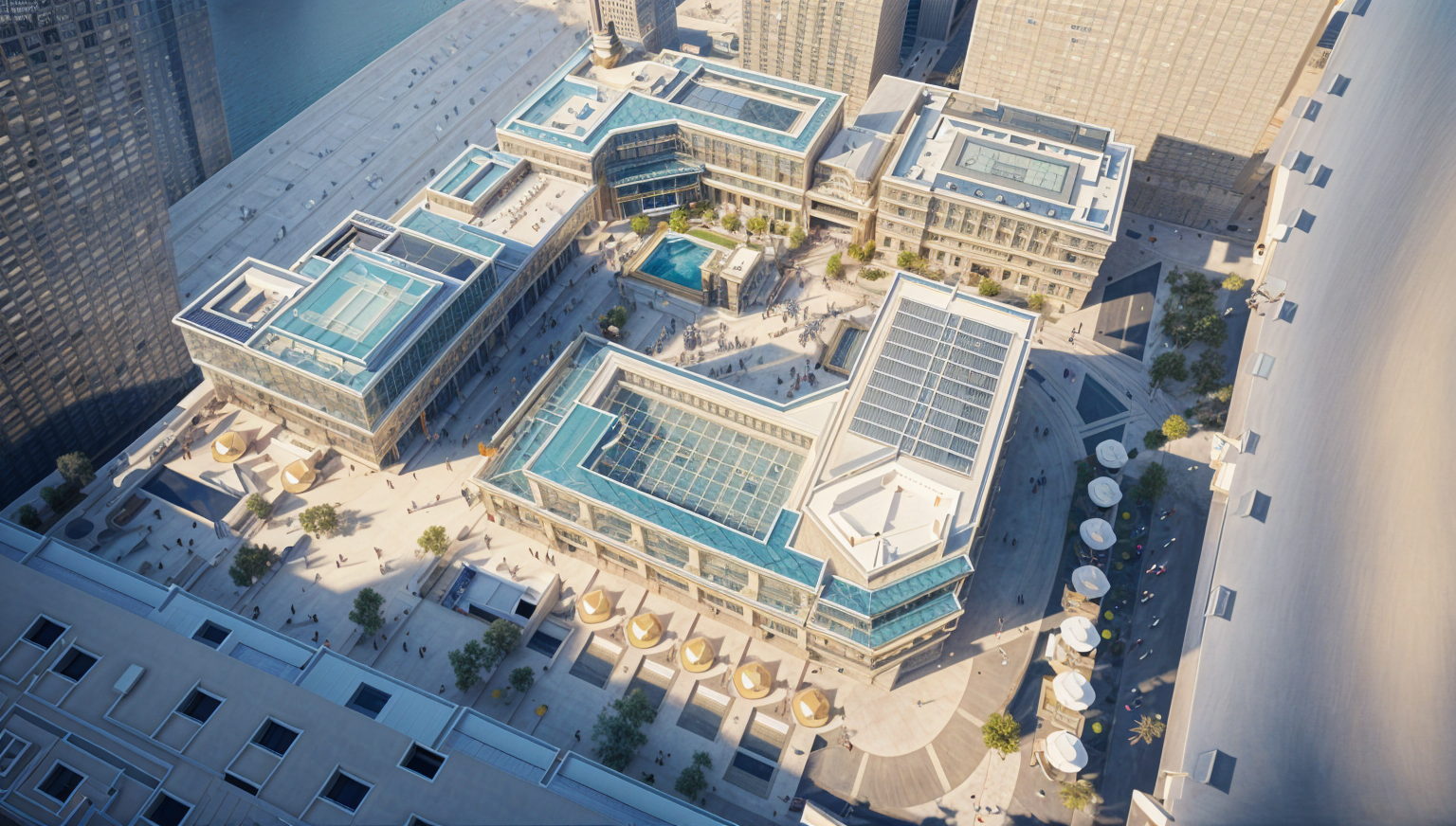 outdoor view shopping center sand stone facade stone columns palm trees teracde green roof architecture