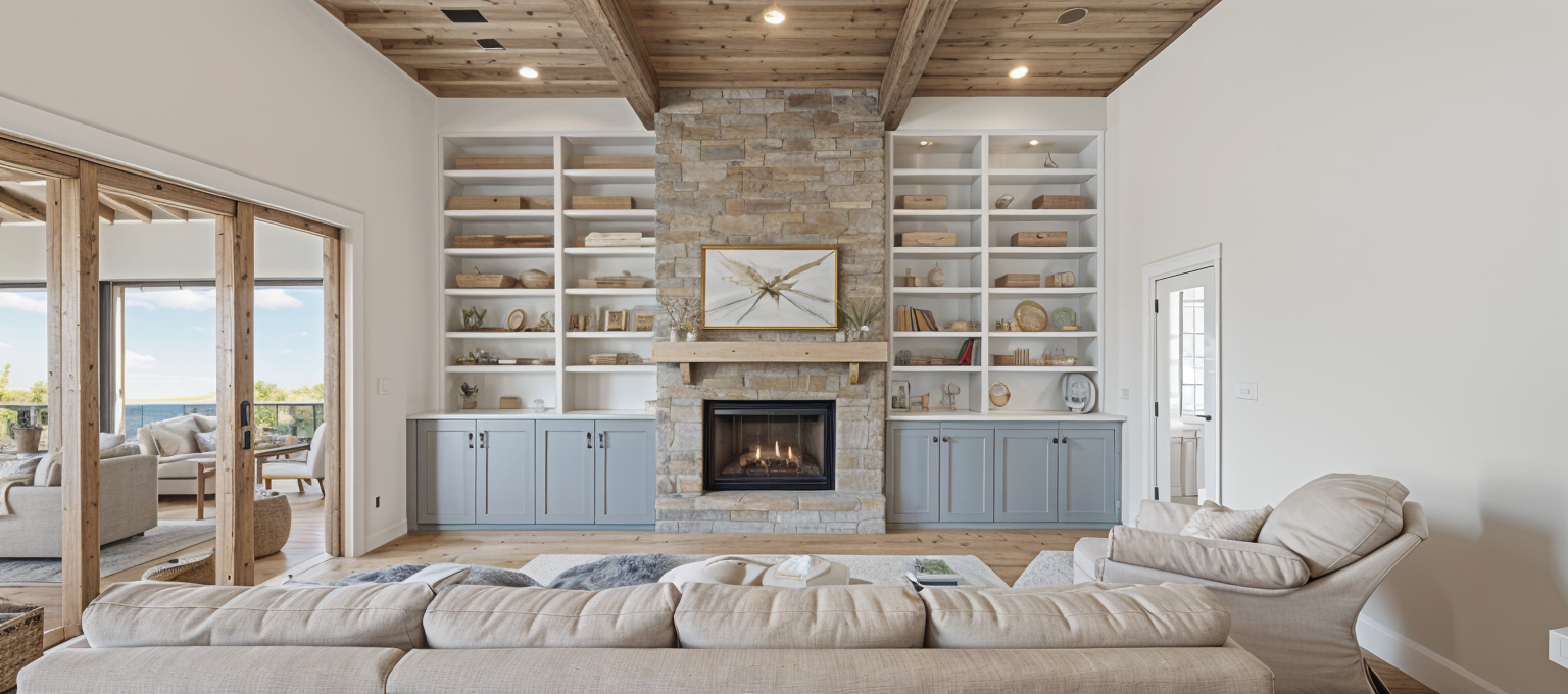 cozy rustic farmhouse design fireplace with built ins with crown molding decor and books on shelving and painted walls black framed doors and windows architecture