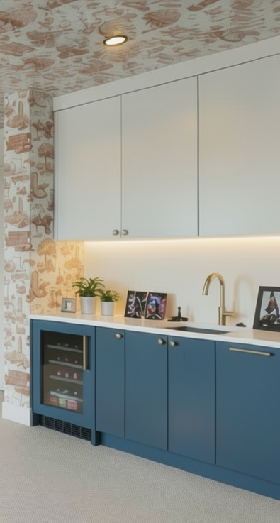 render a contemporary kitchenette with upper cabinets in matte white complemented by lower cabinets in deep navy blue incorporate a patterned wallpaper featuring soft orange and beige tones creating a warm playful atmosphere add a sleek brass faucet and matching hardware for an elegant touch integrate soft under cabinet lighting to highlight a clean white countertop include framed photos a black digital device and small green potted plants for a personal touch design a cozy neutral colored carpeted floor to complete the inviting space