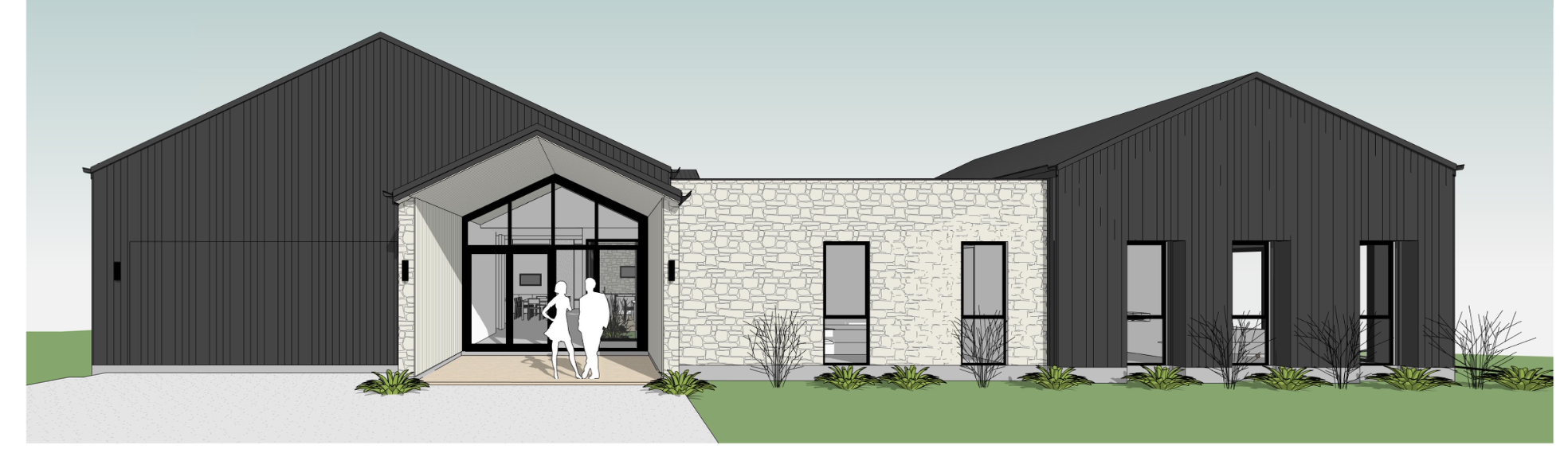 add ash sand colored timber cladding to the ceiling of the entry and down the entry walls add acreage landscape remove leafy ground plants make the stone a soft light sand colour