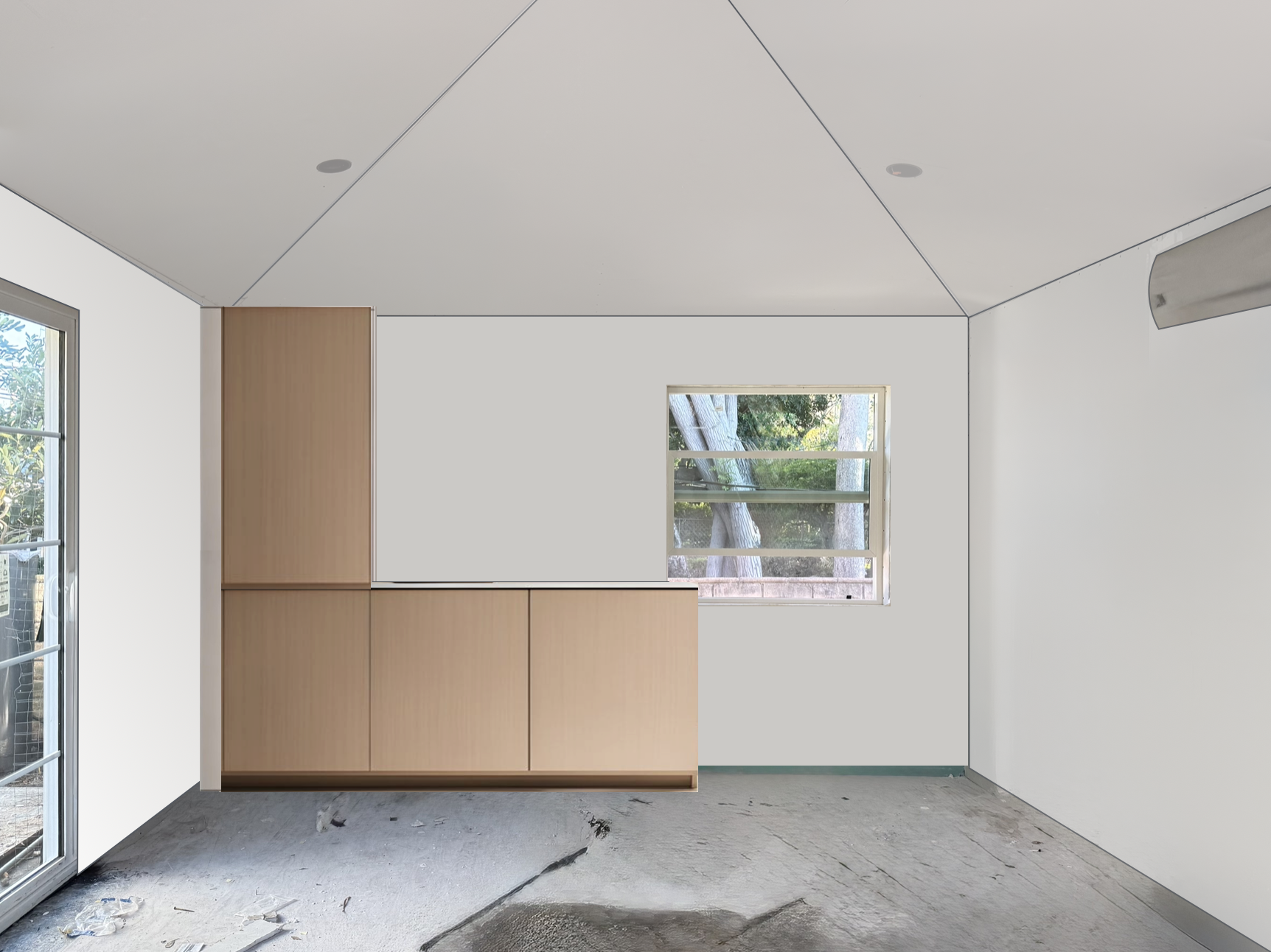 make floors natural white oak matching the existing cabinets add sink on counter and floating shelves above