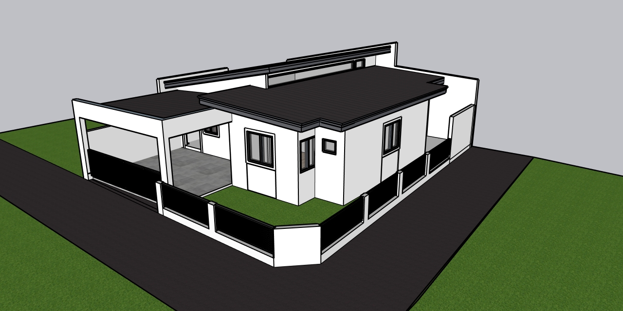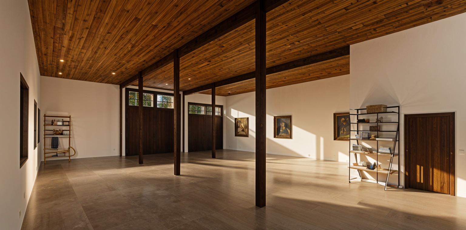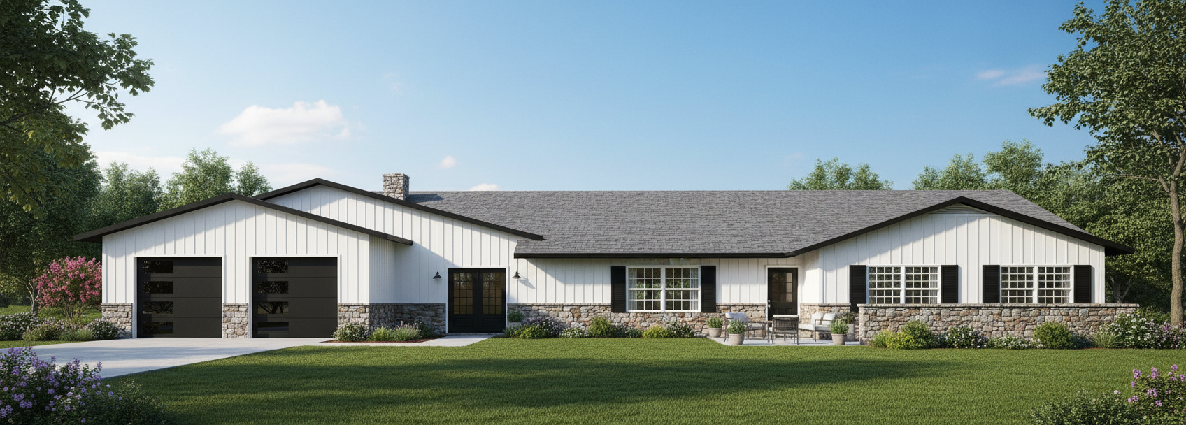 realistic architectural perspective of a modern building scene is set in warm afternoon light with soft natural shadows all wall lamps and interior lights are turned on except for the wall lamp near the window on the right which should be removed interior lighting should also be clearly visible through the clerestory window creating a warm glow from above window moldings are smooth clean and plain white while the rest of the exterior walls use textured white paint for subtle contrast surround the building with lush green trees and landscaped foliage add a car entering from the left side of the frame partially visible as if just arriving include one person walking toward the entrance in a natural casual posture photorealistic materials sharp details global illumination high dynamic range 8k resolution