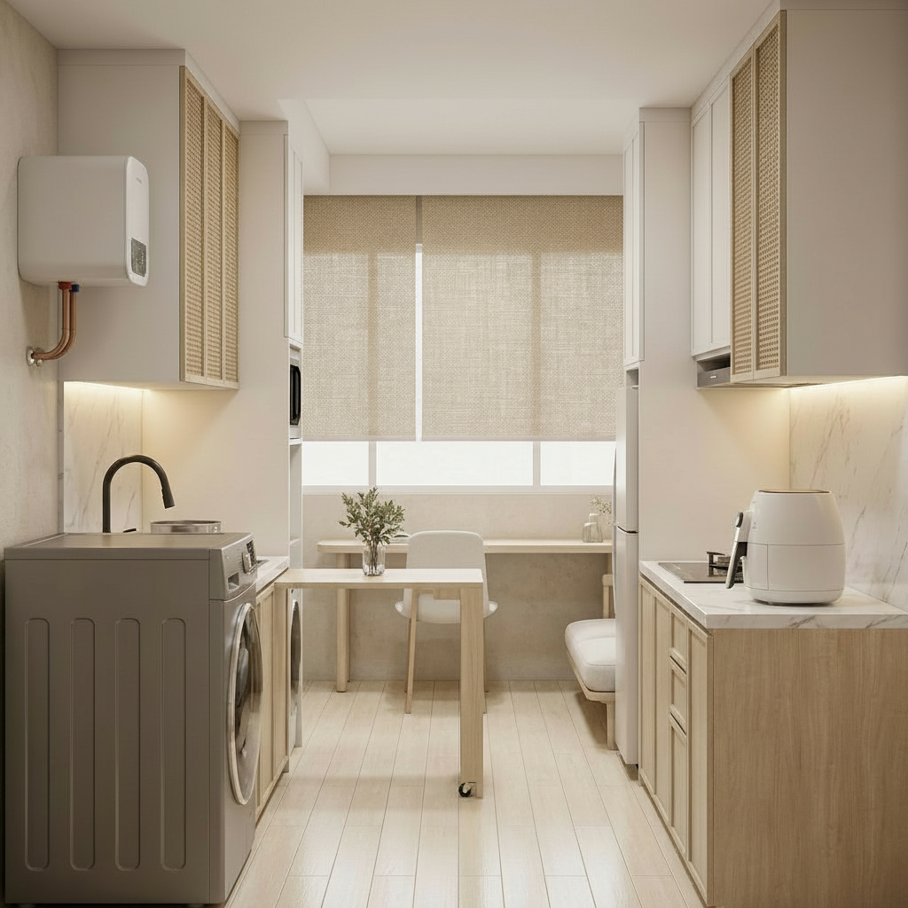 make the wood color to japandi wood and make the ambient render to off white