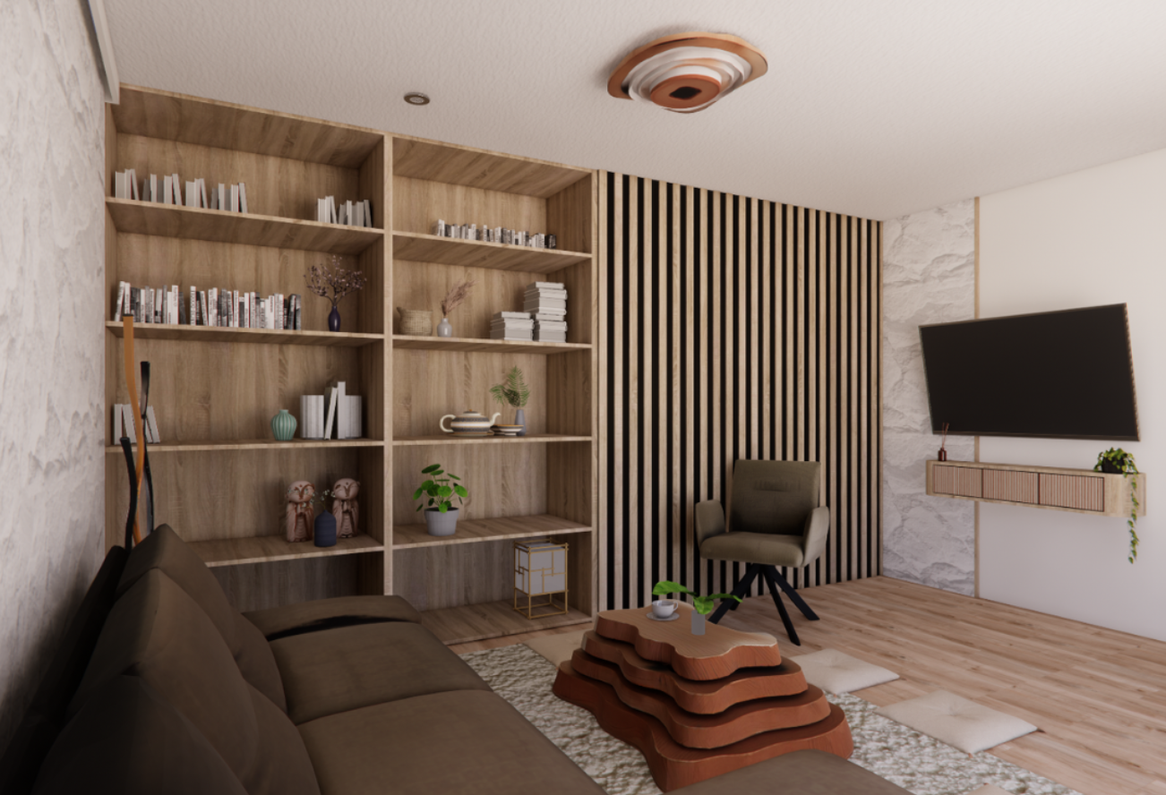 make more realistic render add decoor some light more realistic texture add peoples who seat on chear and read one seat on sofaa and watch tv behaind the camera is a slide window