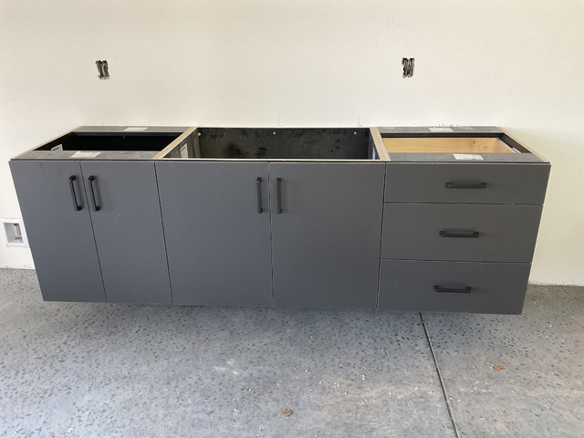 do not change the cabinets in any way preserve the exact cabinet colors materials finishes dimensions door and drawer styles hardware spacing alignment and all geometry exactly as shown do not alter the countertop shape backsplash appliances flooring lighting fixtures or wall structure only remove the construction materials clutter and mess from the scene clean the room and make it look finished and staged add a few simple tasteful home accessories appropriate for the style of the space but do not add or remove any furniture windows or architectural elements maintain the original lighting direction and realism enhance clarity and polish the photo while keeping the cabinetry and room design completely unchanged do not alter the lighting to keep the cabinet colors as they are in the image stage these cabinets in a garage and make them go the full length of a wall with a stainless steel countertop for a garage