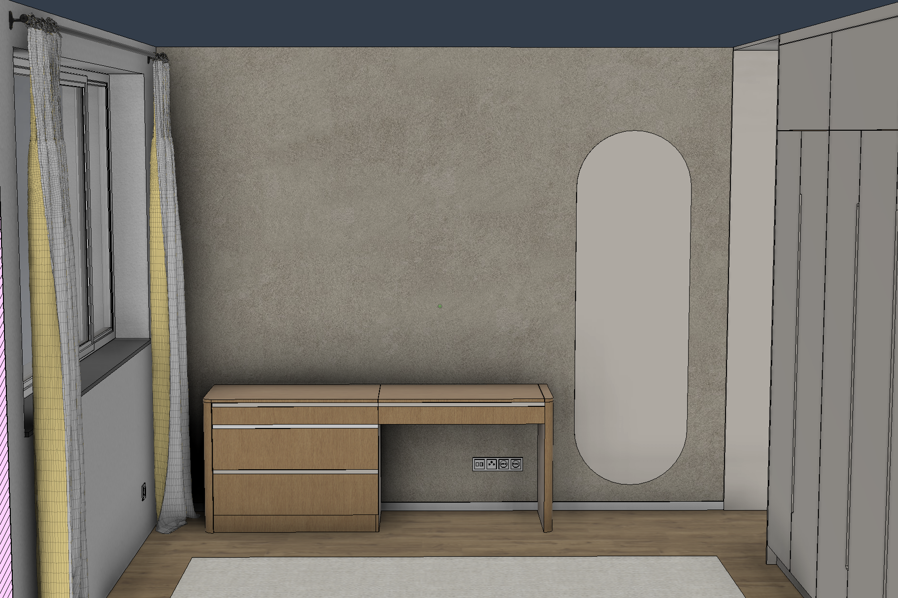 photorealistic interior scene scandinavian minimal style a wooden dresser made of natural oak wood with softly rounded edges the dresser features subtle milled recessed handles painted in a chalk finish matte light beige chalk color the wood grain is visible and high quality on the left side of the dresser place a medium sized indoor plant in a simple ceramic pot on top of the dresser place two books casually stacked to the right side of the scene include a tall wardrobe in a matte chalk color light beige completely handleless with a clean flat surface the flooring is brown oak wood with natural texture and warm tone on the floor place a light grey carpet with soft fabric texture lighting soft natural daylight diffused coming from the side creating gentle shadows and a warm atmosphere camera eye level slight angle not front on realistic perspective materials high detail realistic textures oak grain matte lacquer fabric style clean minimal calm premium interior visualization negative prompt doporu eno no clutter no excessive decoration no glossy plastic surfaces no saturated colors no harsh shadows no distortion no warped perspective no extra furniture no handles on wardrobe