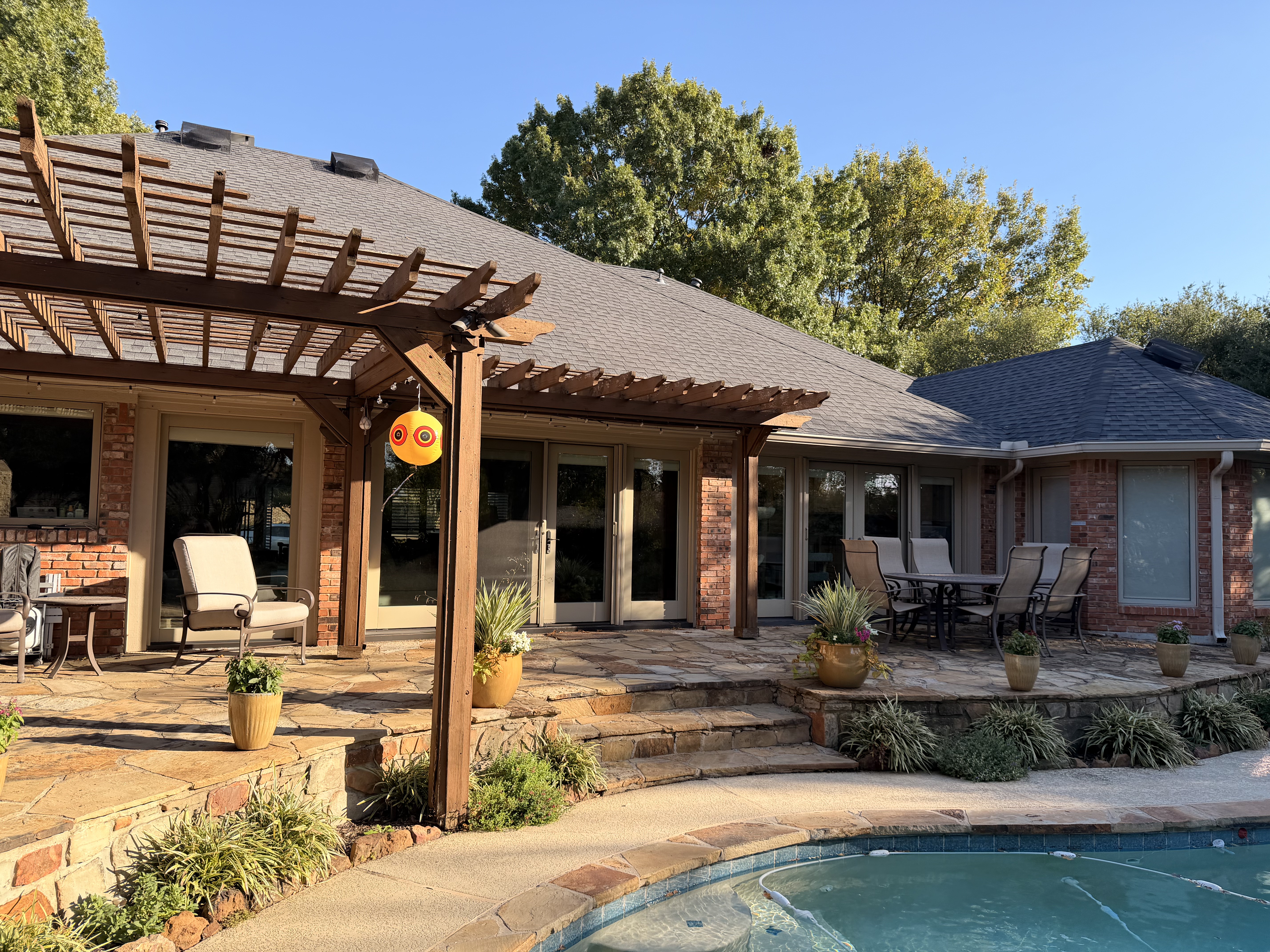 exterior shot add screen porch rafters swimming pool foreground one story house
