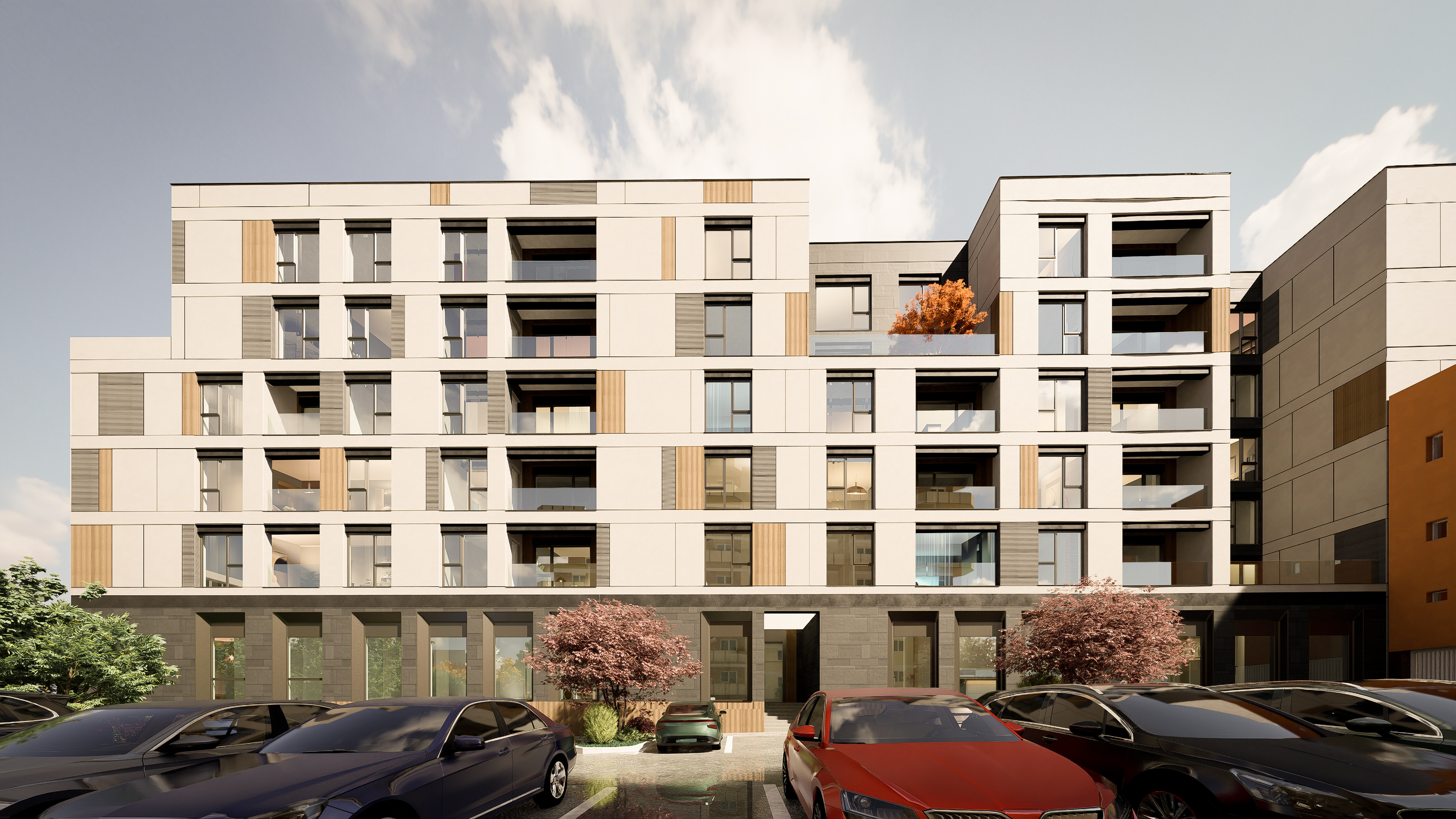 important preserve the existing geometry and the existing context exactly as provided do not modify alter reinterpret add remove scale or reshape any geometry do not change the site surroundings street layout neighboring buildings vegetation or context elements do not modify geometry scale proportions buildings road layout sidewalks or surrounding context in any way warm interior lighting visible through windows soft and natural neutral exterior lighting early evening soft sky realistic light falloff photorealistic architectural rendering clean and balanced contrast calm cinematic mood style contemporary european residential architecture minimalist premium understated delet all the people and cars existing include well dressed people in motion subtle motion blur light urban traffic modern cars and a discreet bus in the background for realism
