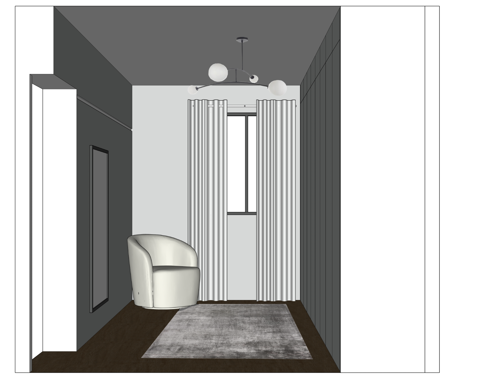 render my image make the walls and cabinets light grey add antique brass knobs to cabinet on right wall make chair medium grey and add a linen beige cushion keep the texture int he rug the same add sheer linen texture to the curtains add light source to the ceiling light