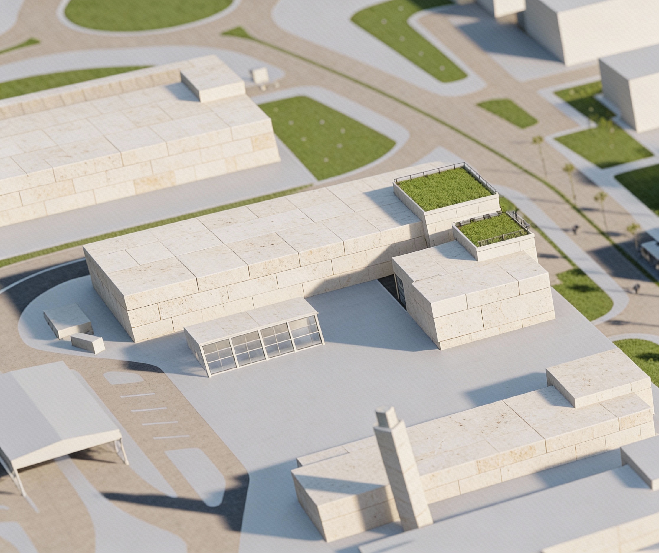 render a modern architectural design featuring a minimalist house with large glass windows and flat roofs use soft white for the walls paired with light beige accents for contrast render the pool with a clear inviting blue create an atmosphere of tranquility and luxury set during golden hour to enhance the warmth of the scene surround the house with subtle greenery and ensure the light casts gentle shadows for added depth