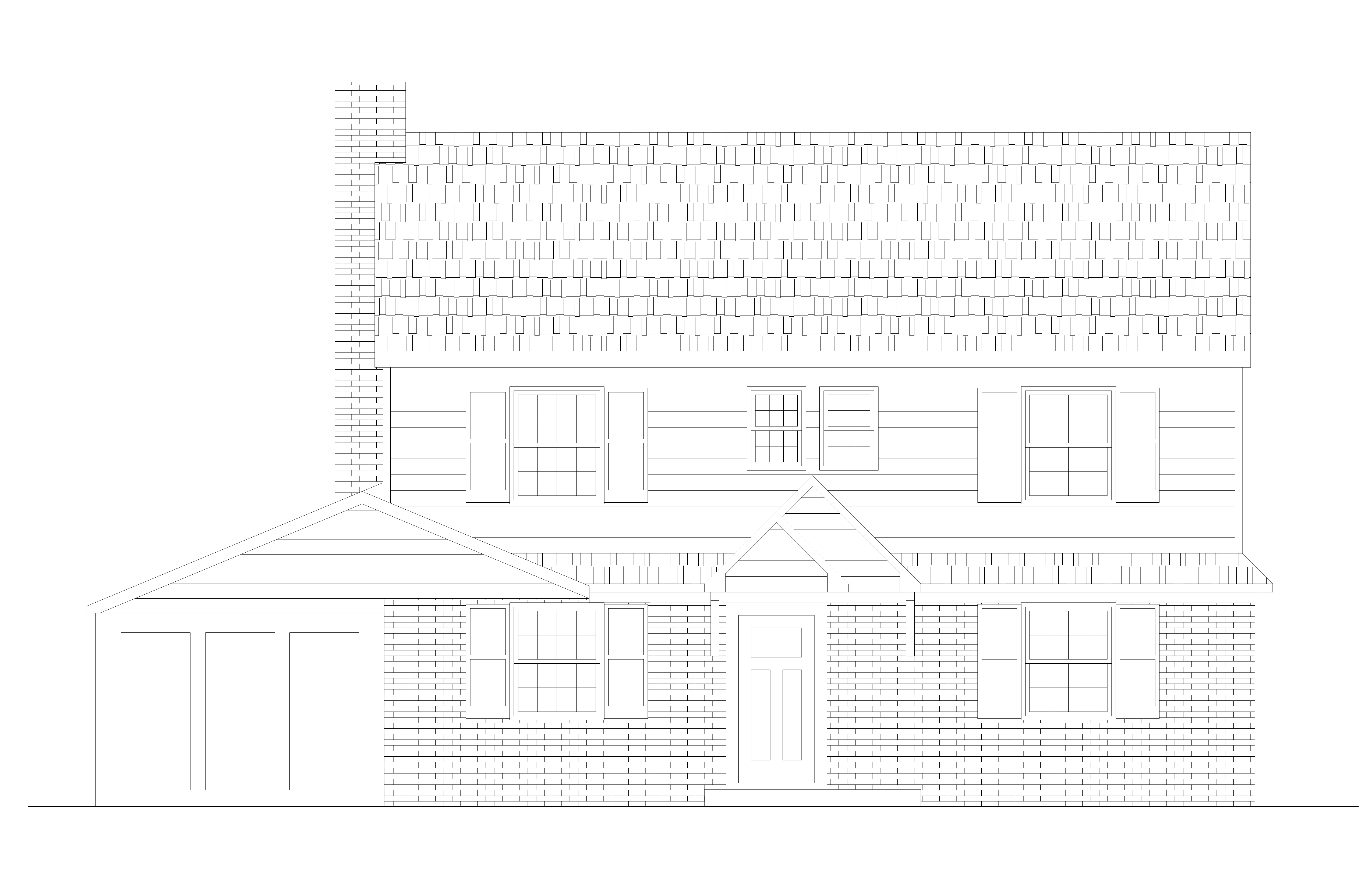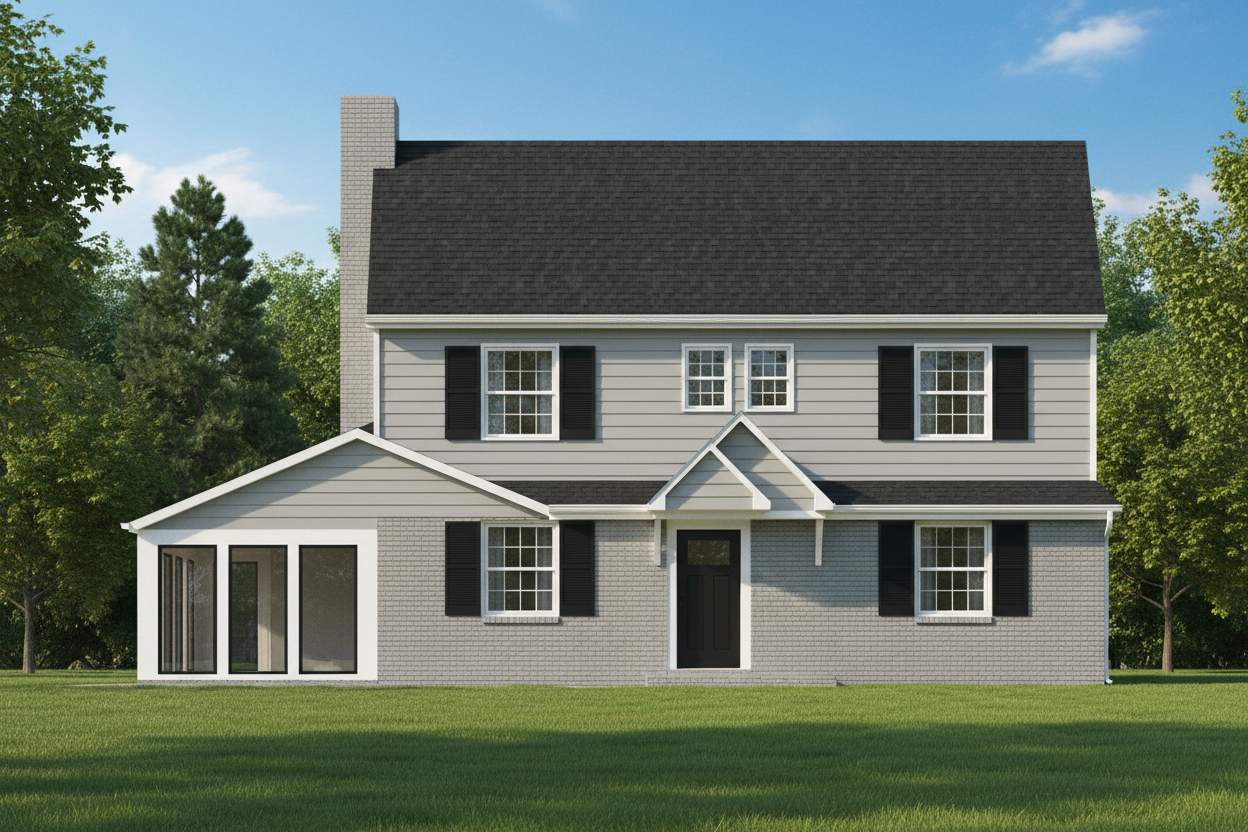 create a realistic cozy suburban house scene with a two story house featuring a light gray exterior with crisp white trim the front door is black adding an inviting touch all windows are framed with black shutters and a subtle grid pattern at the windows the roof is a gentle black shingle contrasting harmoniously with the rest of the facade surround the house with a tranquil lush green lawn under a crisp clear blue sky casting soft natural shadows to enhance the serene atmosphere add trees in the background no garage door but three tall casement windows create a sunroom on the left where a garage door is shown brick is painted light gray add bracket to right side of door add sidewalk to concrete stoop